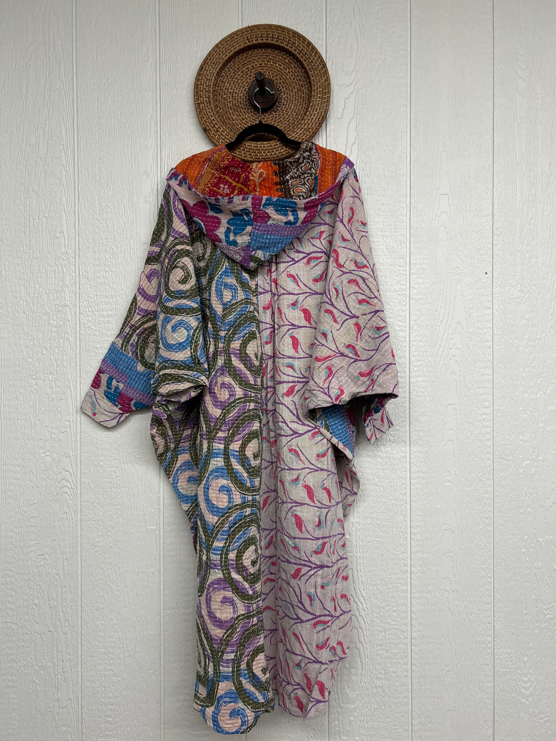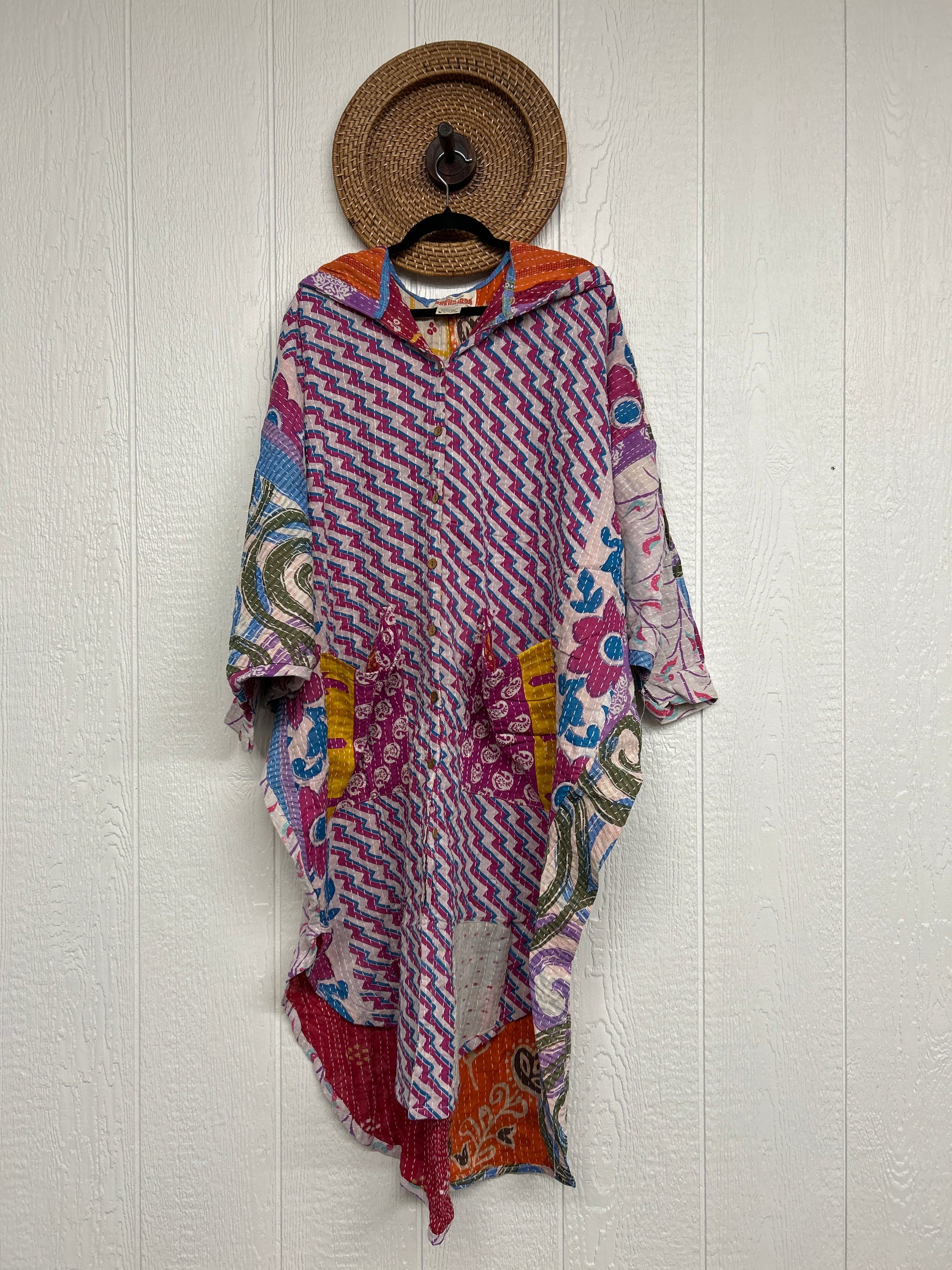 Made from our hand kantha stitched vintage cotton sari, this piece of wearable art features a Button-down opening with functional buttons, slouchy outer pockets, billowy sleeves, a rounded hemline and a vibey hood. The perfect maxi to compliment your favorite kantha pants or bell bottoms.