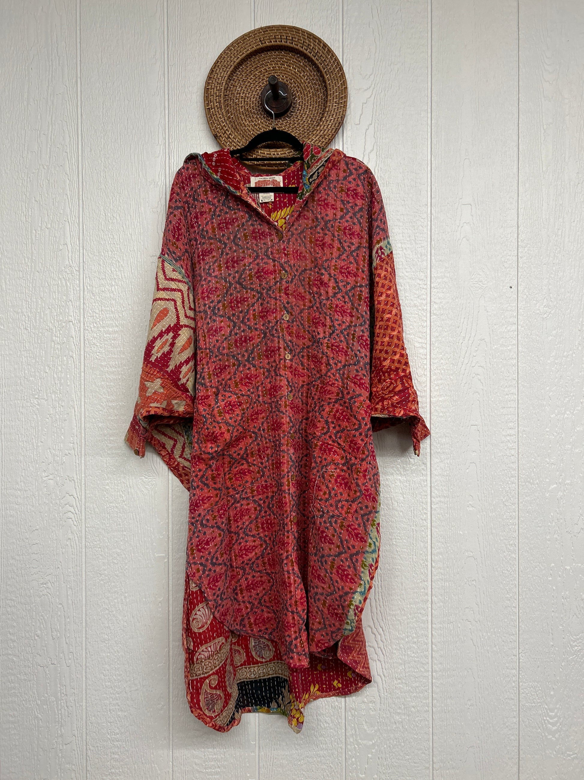 Made from our hand kantha stitched vintage cotton sari, this piece of wearable art features a Button-down opening with functional buttons, slouchy outer pockets, billowy sleeves, a rounded hemline and a vibey hood. The perfect maxi to compliment your favorite kantha pants or bell bottoms.