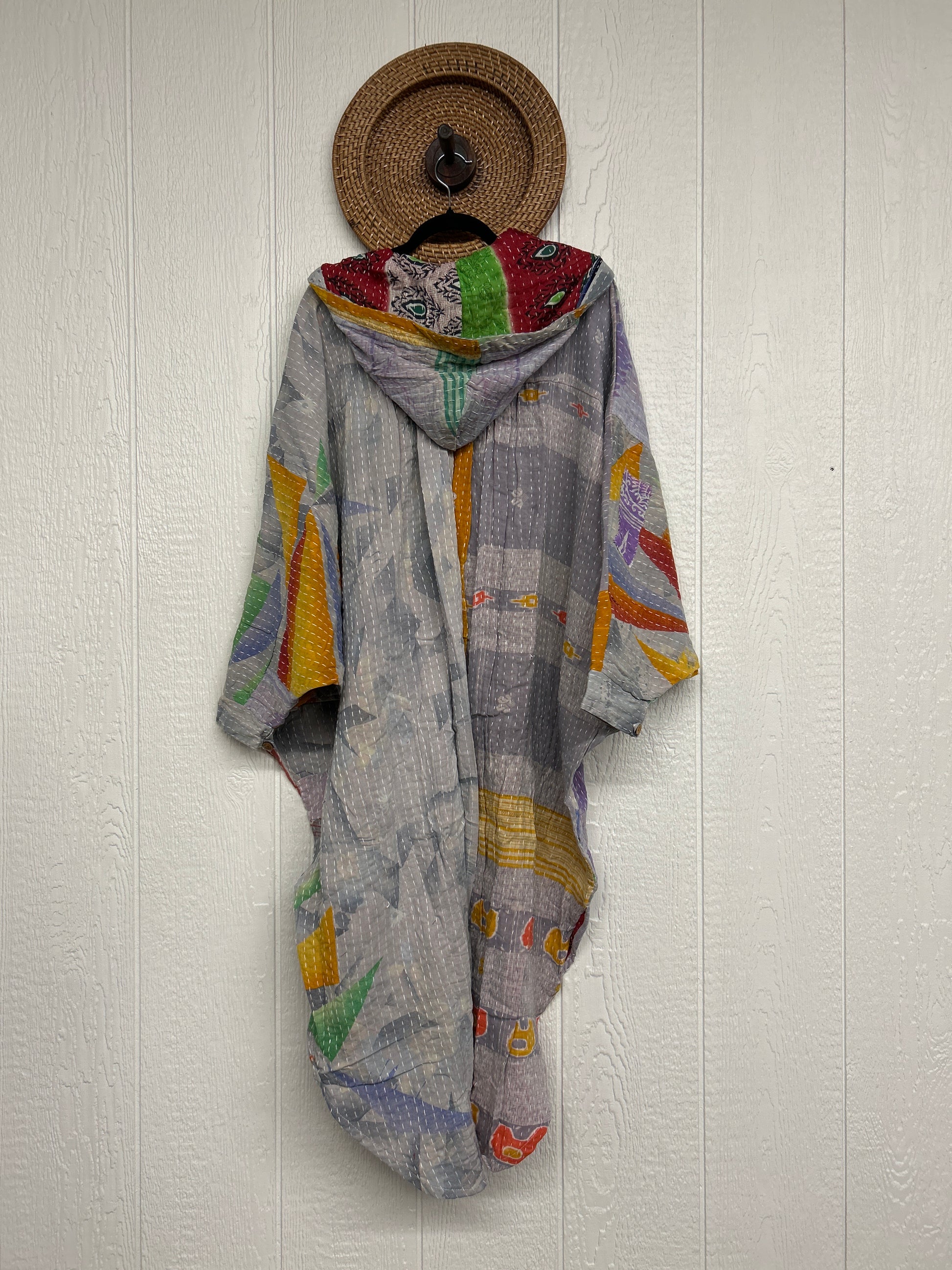 Made from our hand kantha stitched vintage cotton sari, this piece of wearable art features a Button-down opening with functional buttons, slouchy outer pockets, billowy sleeves, a rounded hemline and a vibey hood. The perfect maxi to compliment your favorite kantha pants or bell bottoms.