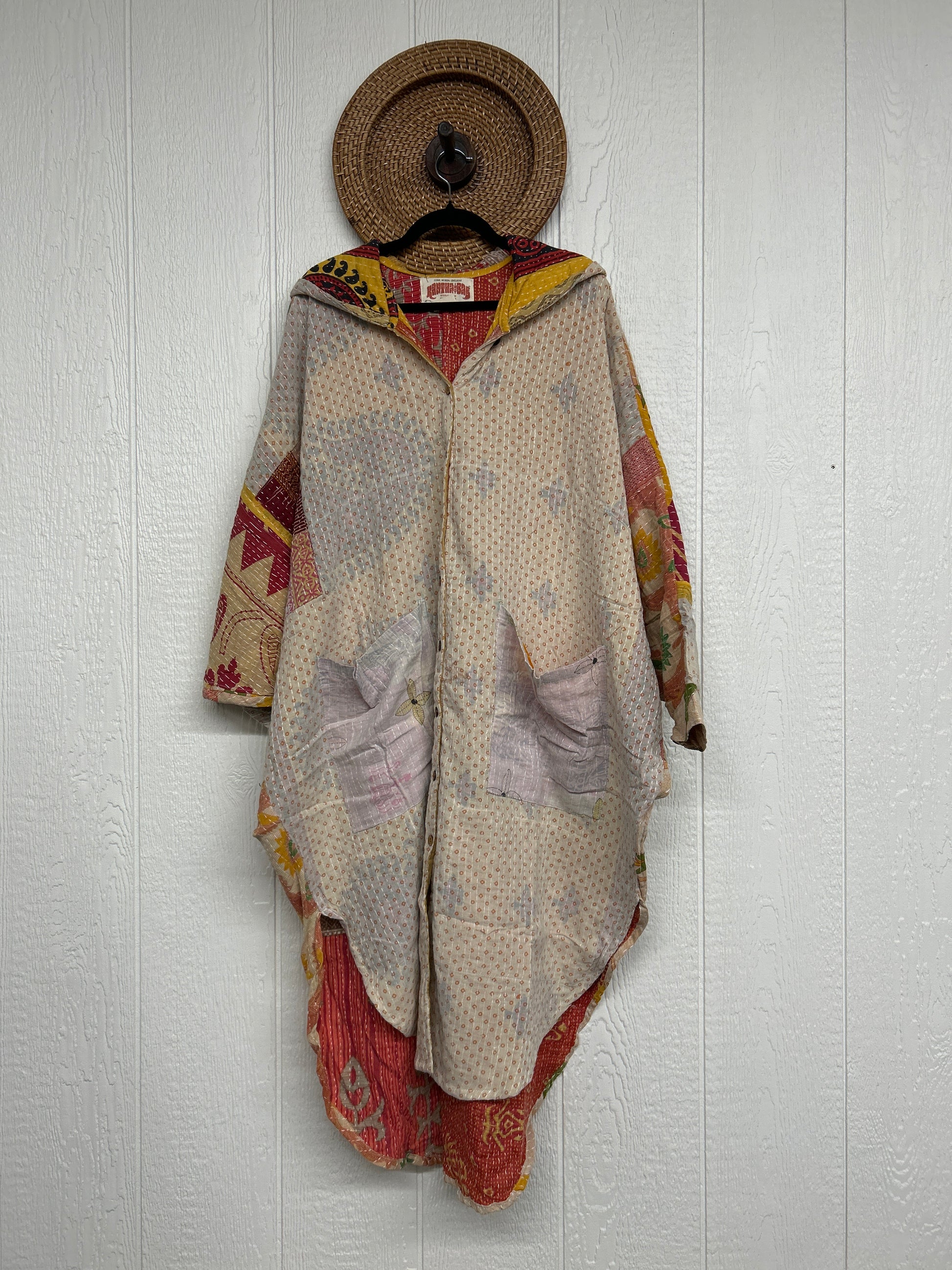 Made from our hand kantha stitched vintage cotton sari, this piece of wearable art features a Button-down opening with functional buttons, slouchy outer pockets, billowy sleeves, a rounded hemline and a vibey hood. The perfect maxi to compliment your favorite kantha pants or bell bottoms.