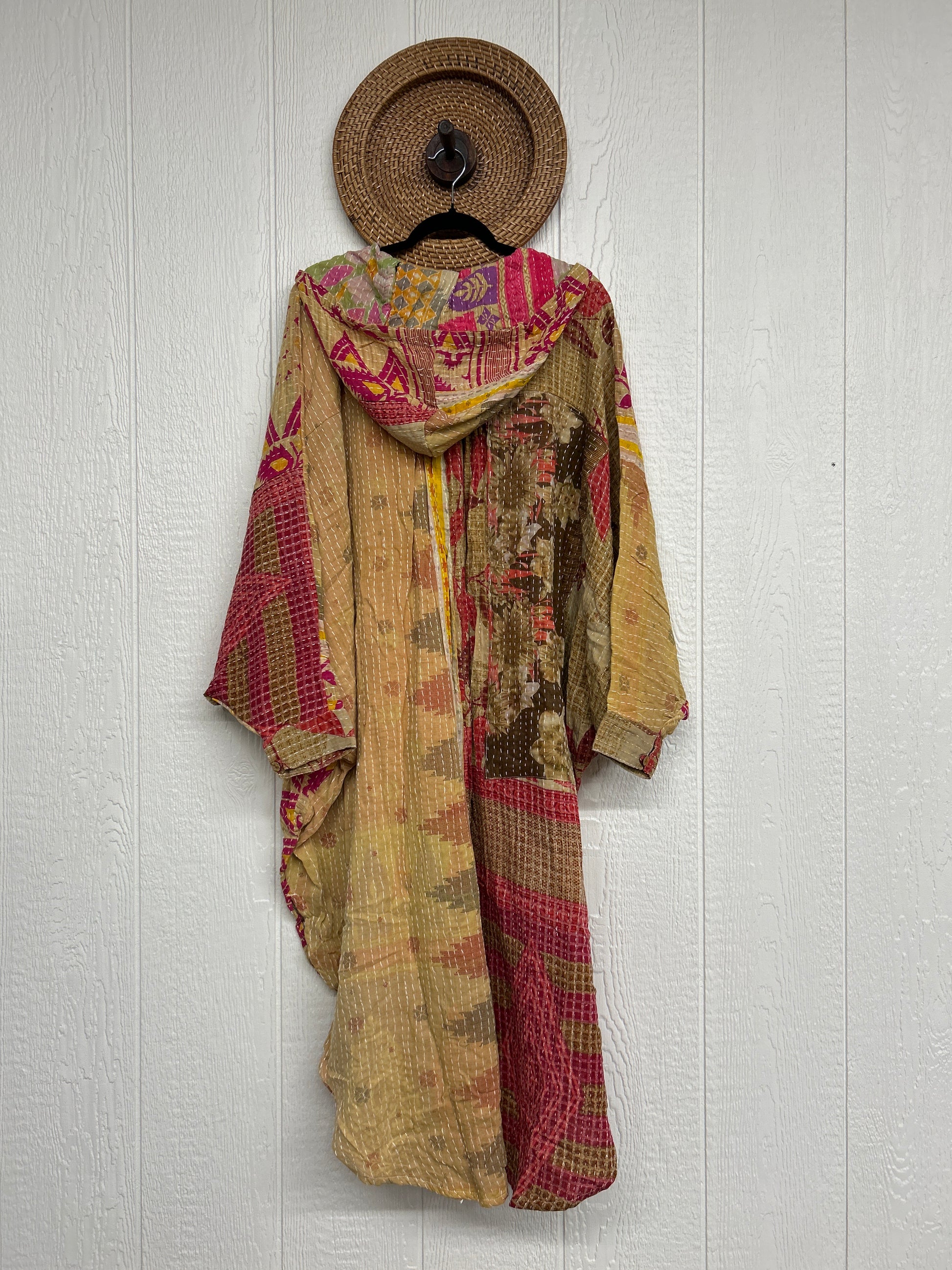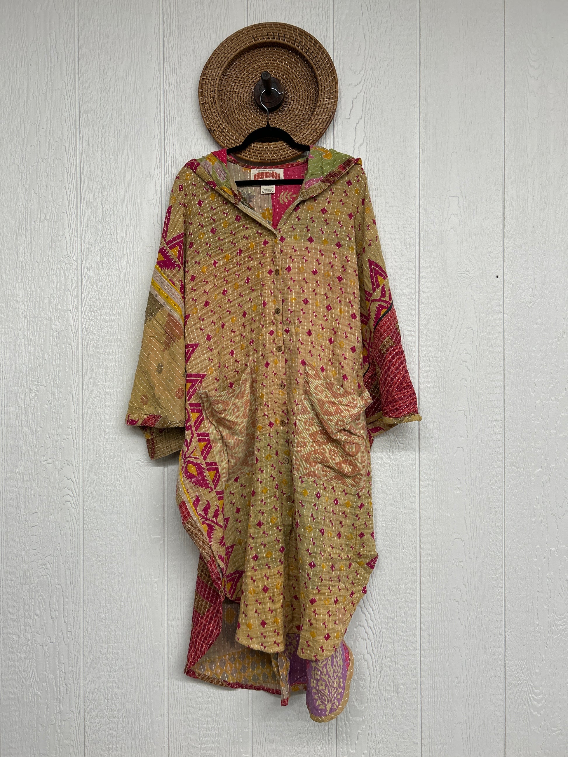 Made from our hand kantha stitched vintage cotton sari, this piece of wearable art features a Button-down opening with functional buttons, slouchy outer pockets, billowy sleeves, a rounded hemline and a vibey hood. The perfect maxi to compliment your favorite kantha pants or bell bottoms.