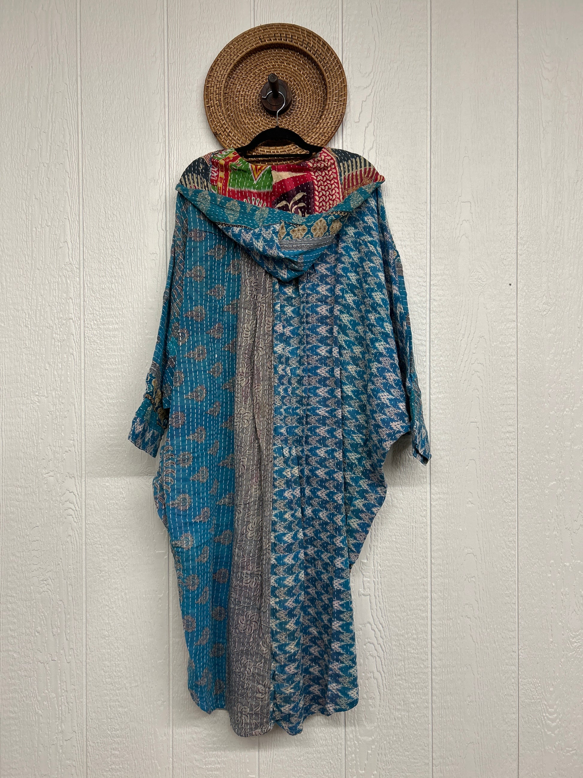 Made from our hand kantha stitched vintage cotton sari, this piece of wearable art features a Button-down opening with functional buttons, slouchy outer pockets, billowy sleeves, a rounded hemline and a vibey hood. The perfect maxi to compliment your favorite kantha pants or bell bottoms.