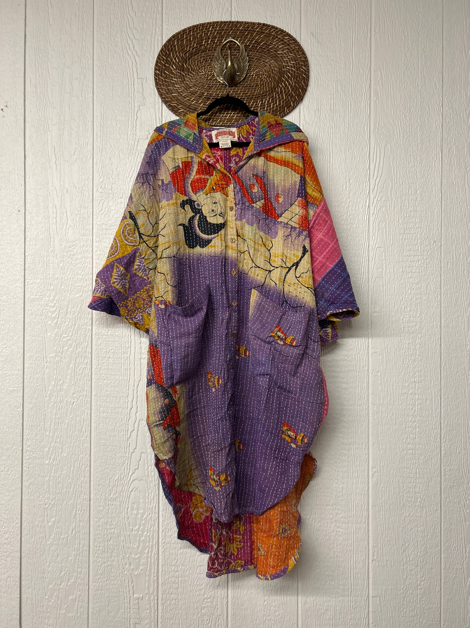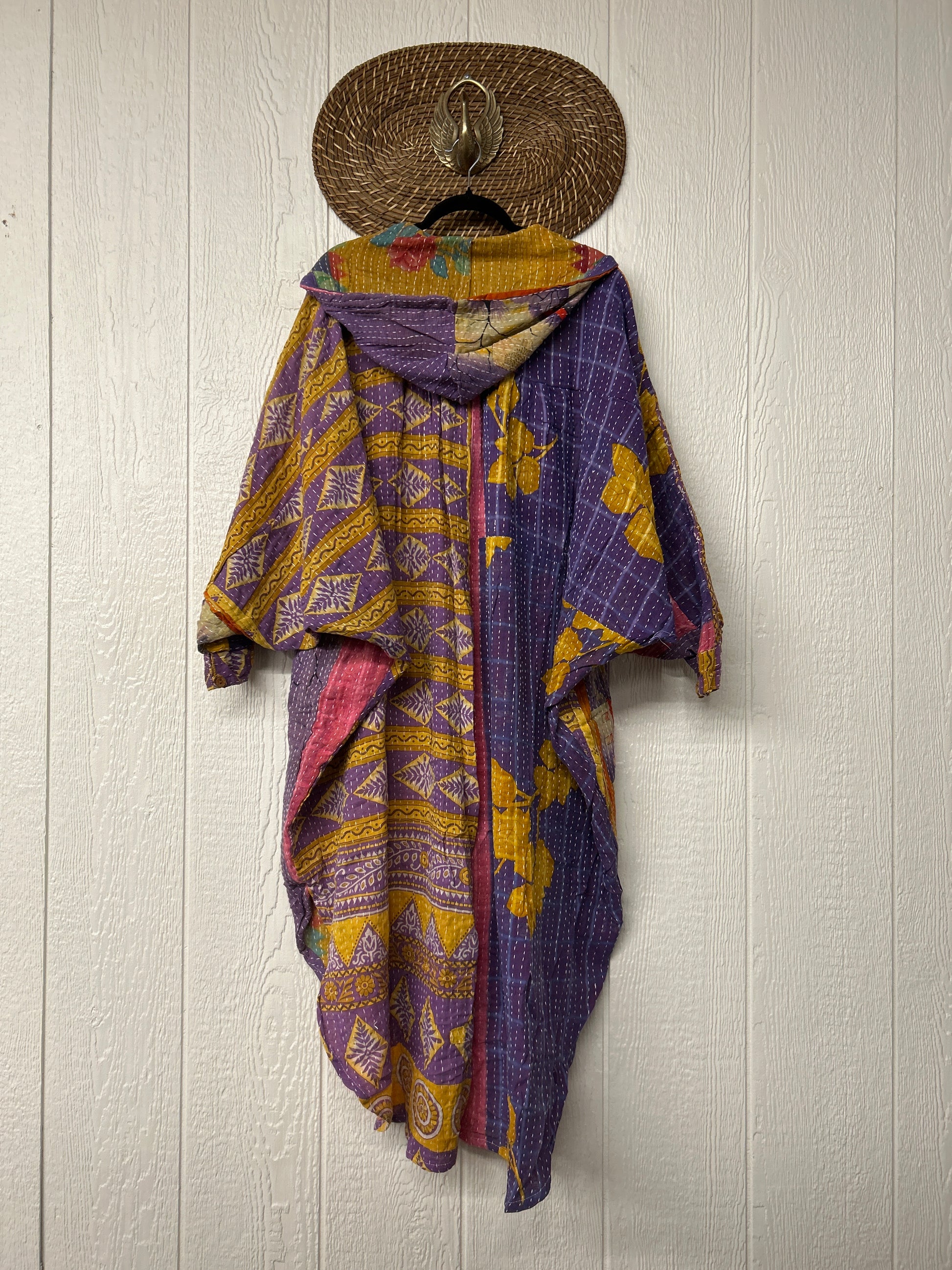 Made from our hand kantha stitched vintage cotton sari, this piece of wearable art features a Button-down opening with functional buttons, slouchy outer pockets, billowy sleeves, a rounded hemline and a vibey hood. The perfect maxi to compliment your favorite kantha pants or bell bottoms.