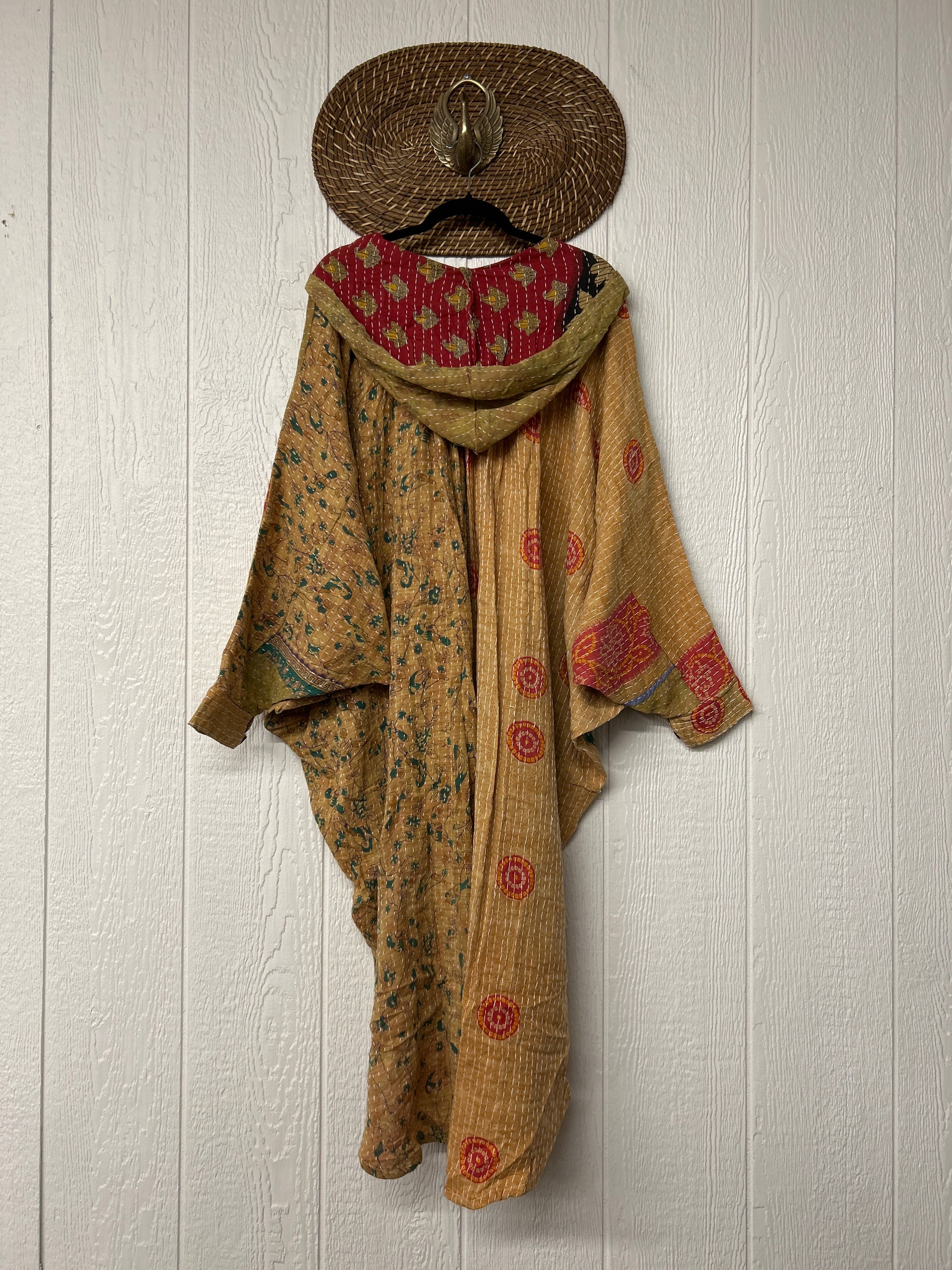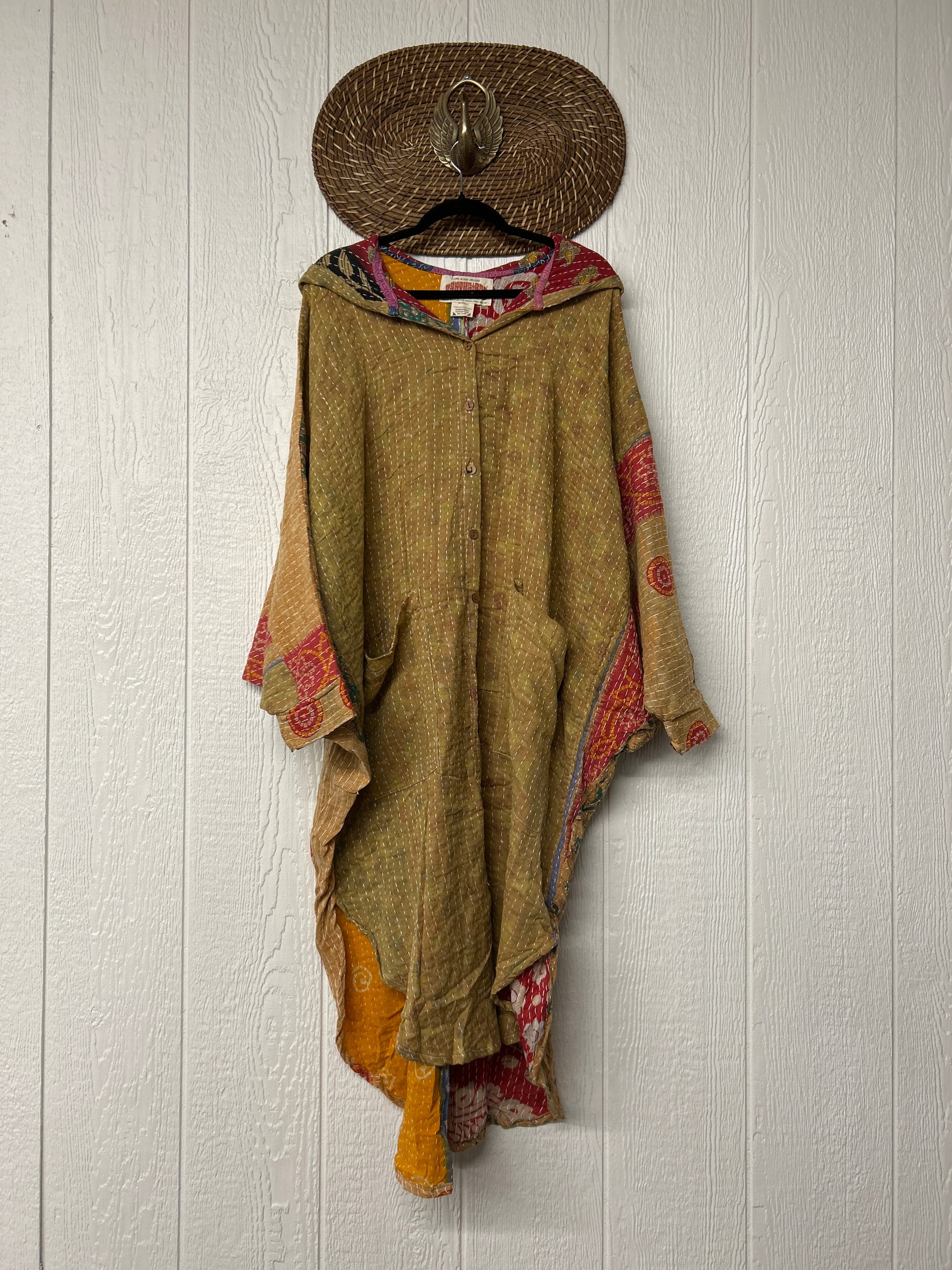 Made from our hand kantha stitched vintage cotton sari, this piece of wearable art features a Button-down opening with functional buttons, slouchy outer pockets, billowy sleeves, a rounded hemline and a vibey hood. The perfect maxi to compliment your favorite kantha pants or bell bottoms.