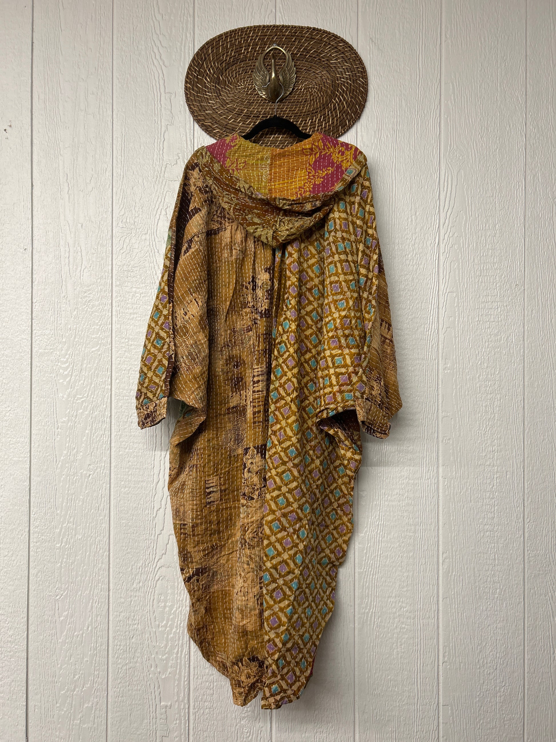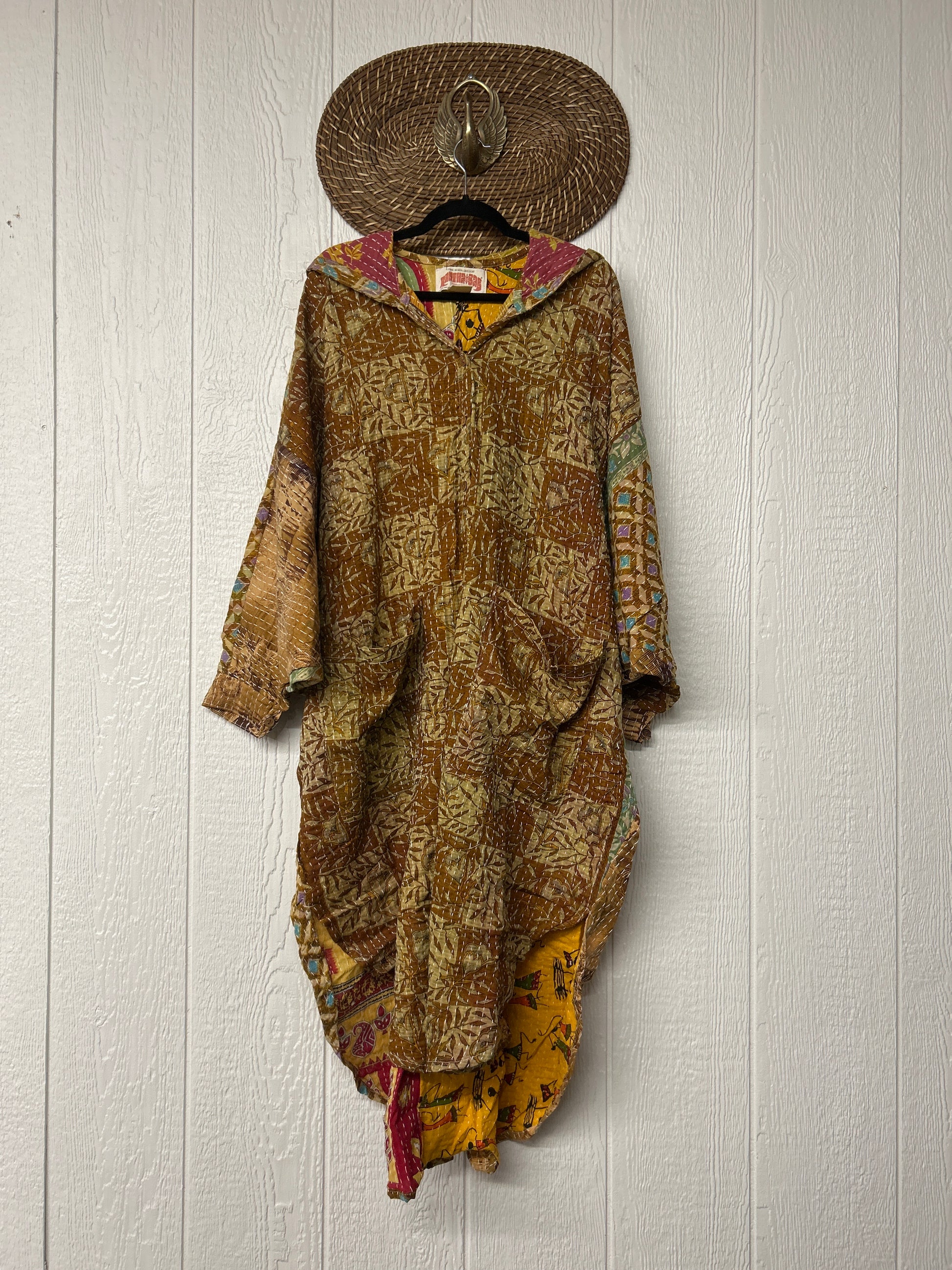 Made from our hand kantha stitched vintage cotton sari, this piece of wearable art features a Button-down opening with functional buttons, slouchy outer pockets, billowy sleeves, a rounded hemline and a vibey hood. The perfect maxi to compliment your favorite kantha pants or bell bottoms.