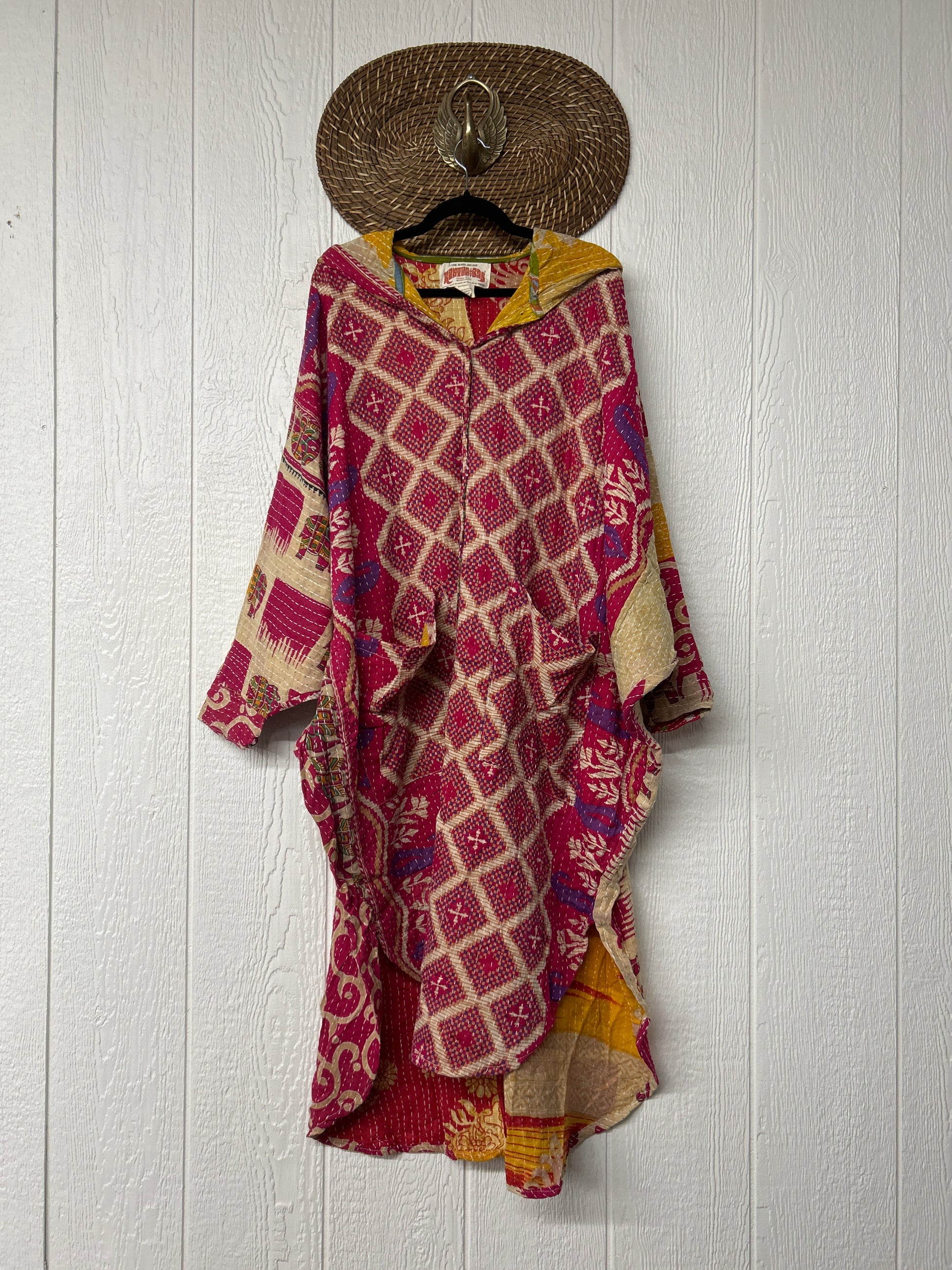 Made from our hand kantha stitched vintage cotton sari, this piece of wearable art features a Button-down opening with functional buttons, slouchy outer pockets, billowy sleeves, a rounded hemline and a vibey hood. The perfect maxi to compliment your favorite kantha pants or bell bottoms.