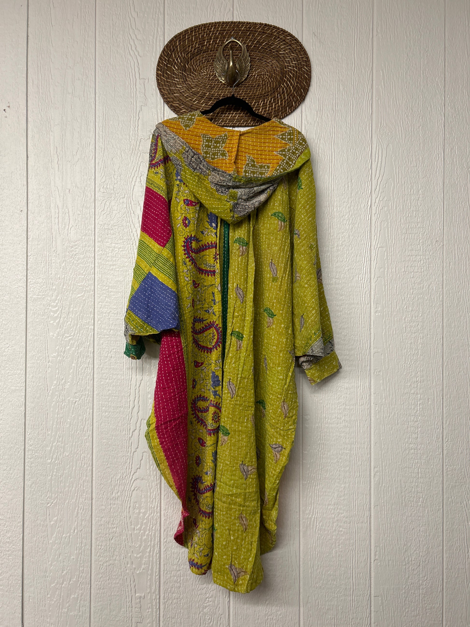 Made from our hand kantha stitched vintage cotton sari, this piece of wearable art features a Button-down opening with functional buttons, slouchy outer pockets, billowy sleeves, a rounded hemline and a vibey hood. The perfect maxi to compliment your favorite kantha pants or bell bottoms.