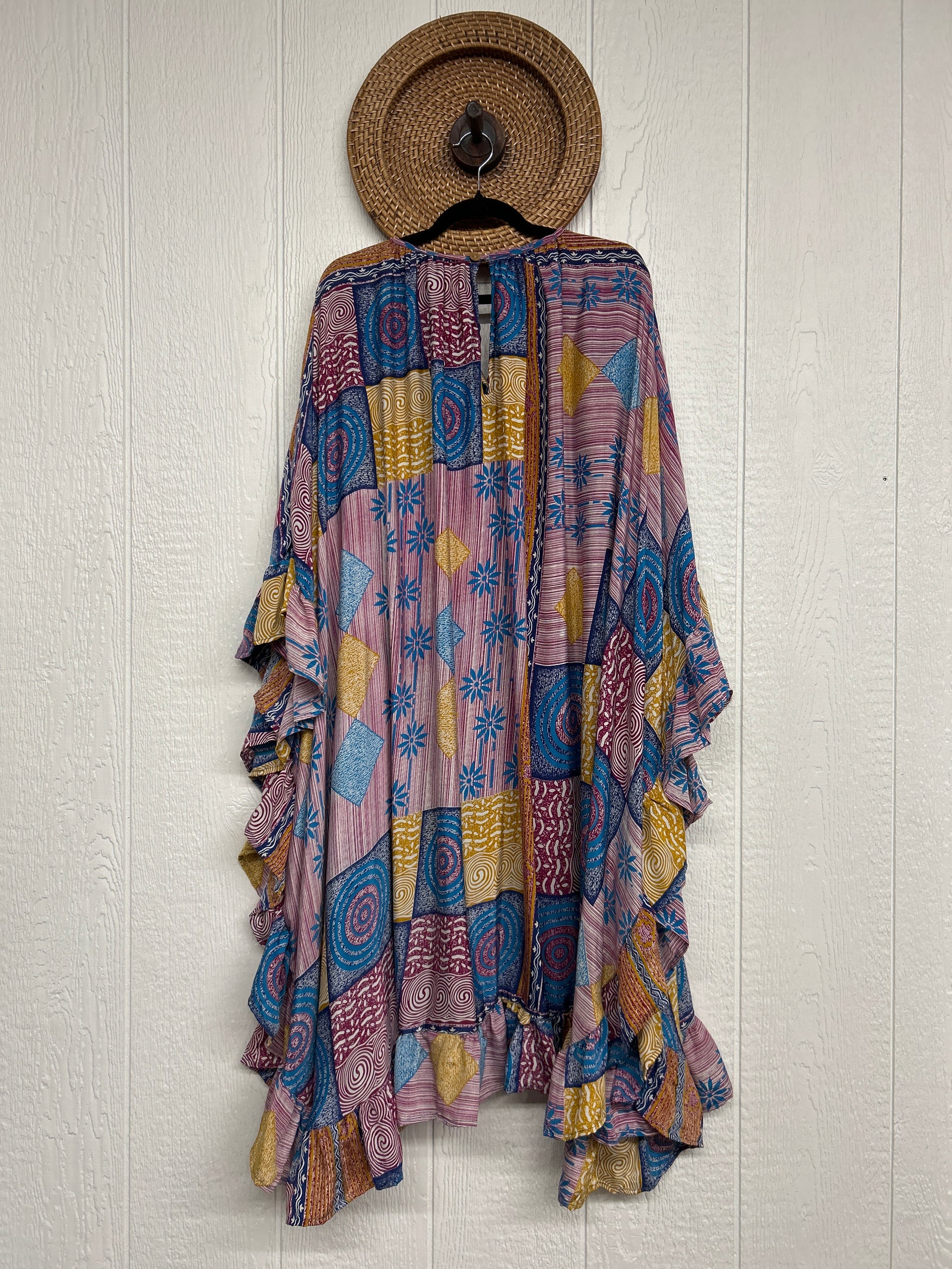 This dreamy muu is crafted from our ultra lux vintage rasgulla sari and features a button down placket and slouchy exterior pockets. Ruffles around the hem make this the ultimate rockstar layer that you can wear closed as a muu or open as a kimono!!