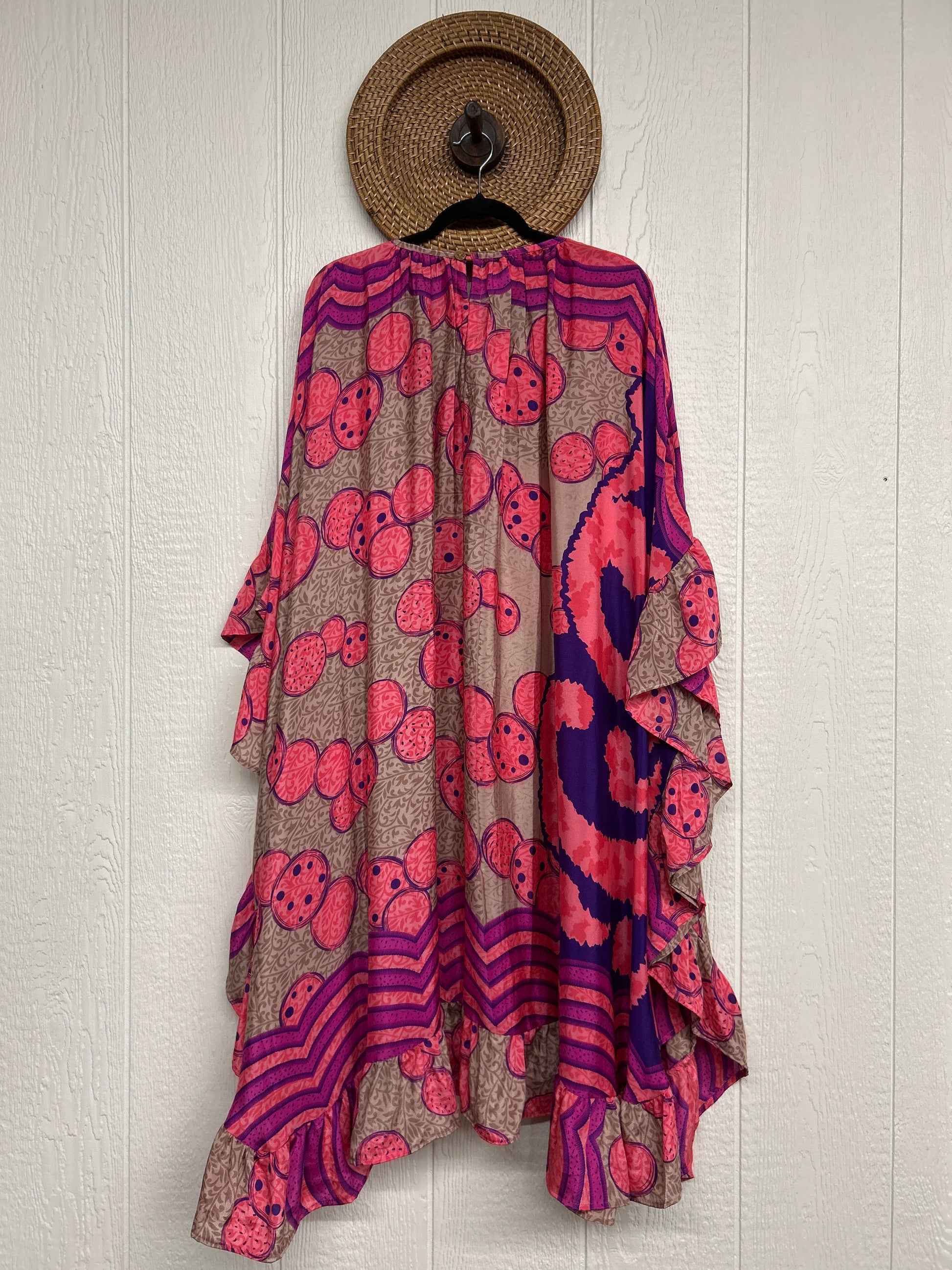 This dreamy muu is crafted from our ultra lux vintage rasgulla sari and features a button down placket and slouchy exterior pockets. Ruffles around the hem make this the ultimate rockstar layer that you can wear closed as a muu or open as a kimono!!