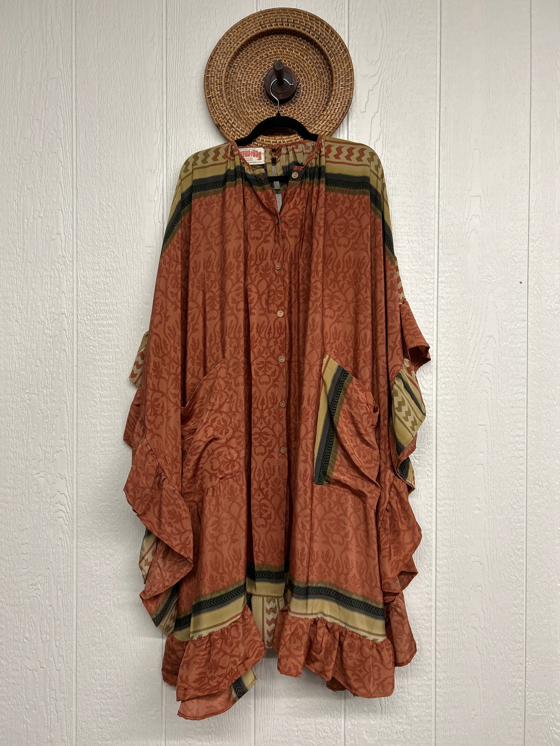 This dreamy muu is crafted from our ultra lux vintage rasgulla sari and features a button down placket and slouchy exterior pockets. Ruffles around the hem make this the ultimate rockstar layer that you can wear closed as a muu or open as a kimono!!