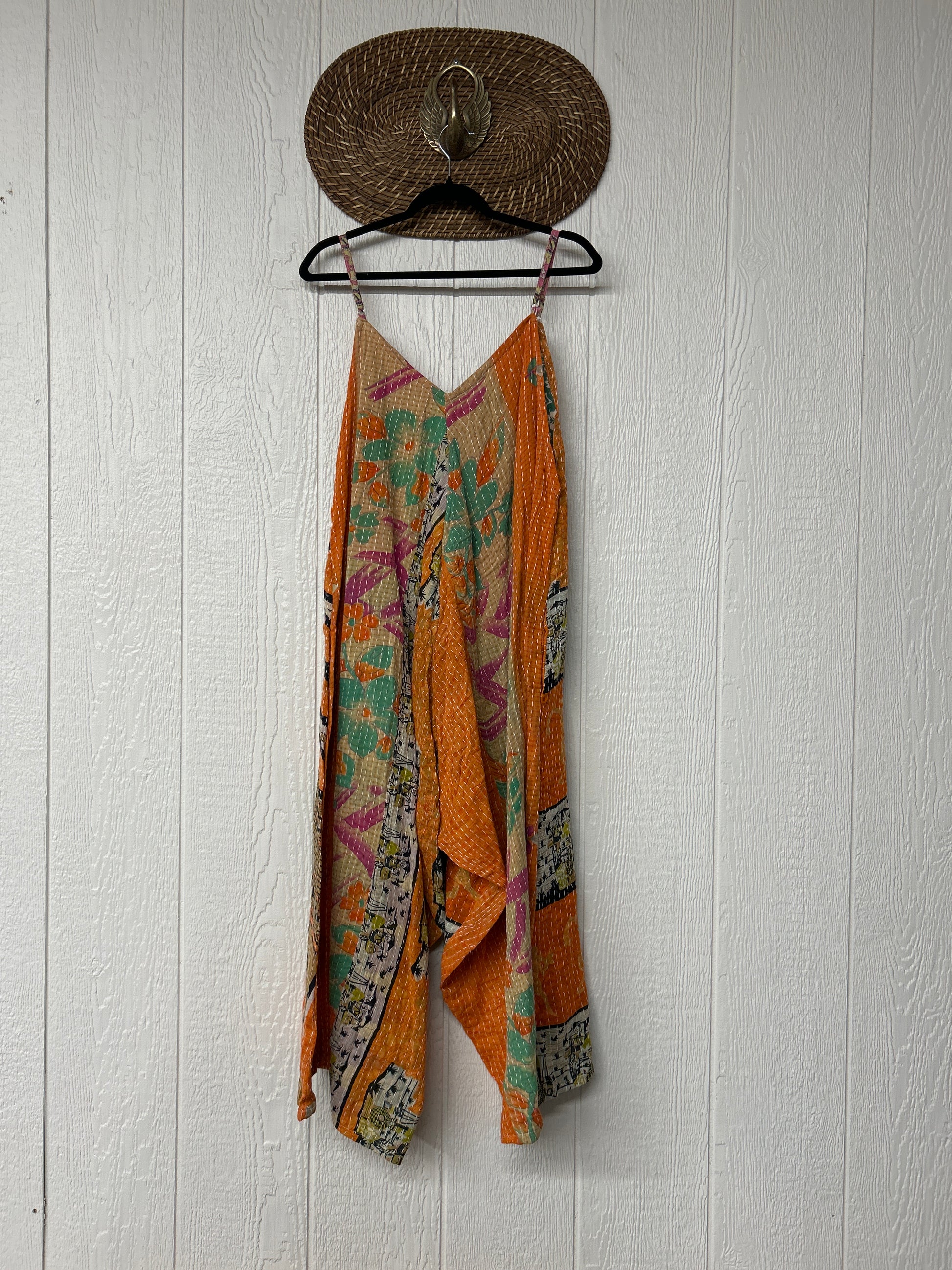 Crafted from vintage cotton kantha stitched sari this fully reversible jumpsuit features interior pockets, adjustable straps, wide legs & a double v neckline.