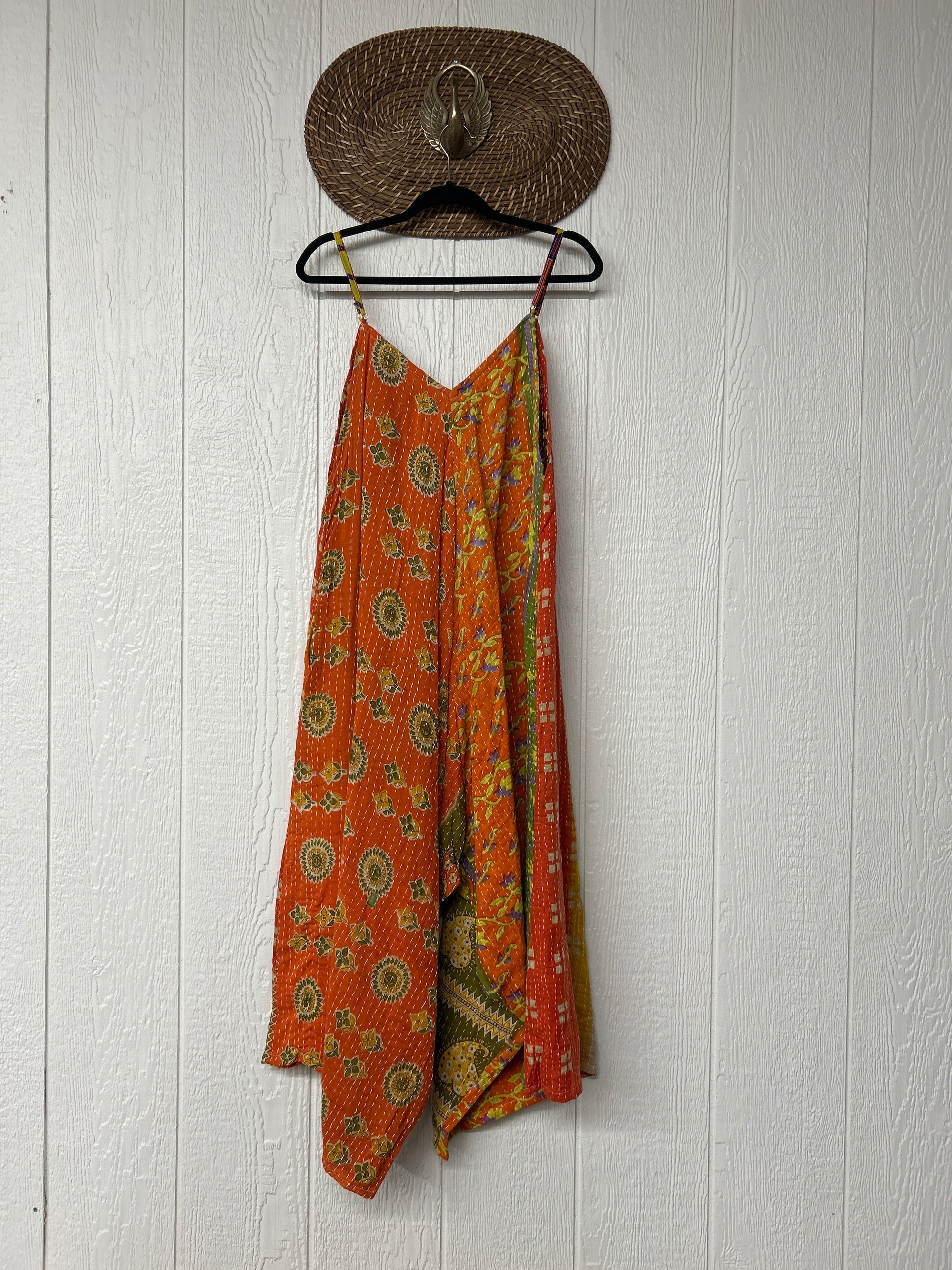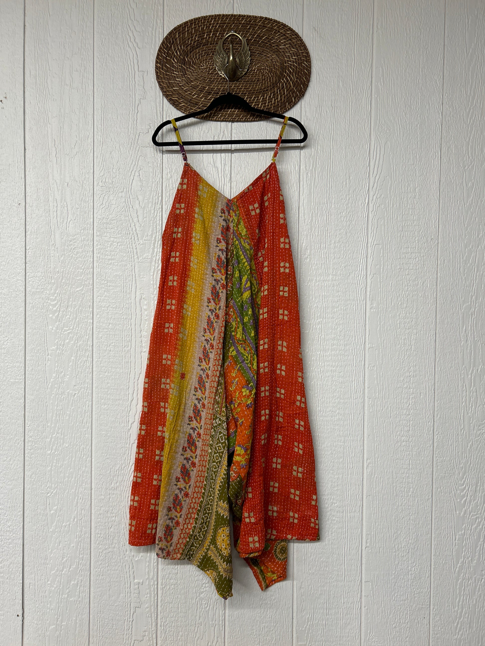 Crafted from vintage cotton kantha stitched sari this fully reversible jumpsuit features interior pockets, adjustable straps, wide legs & a double v neckline.