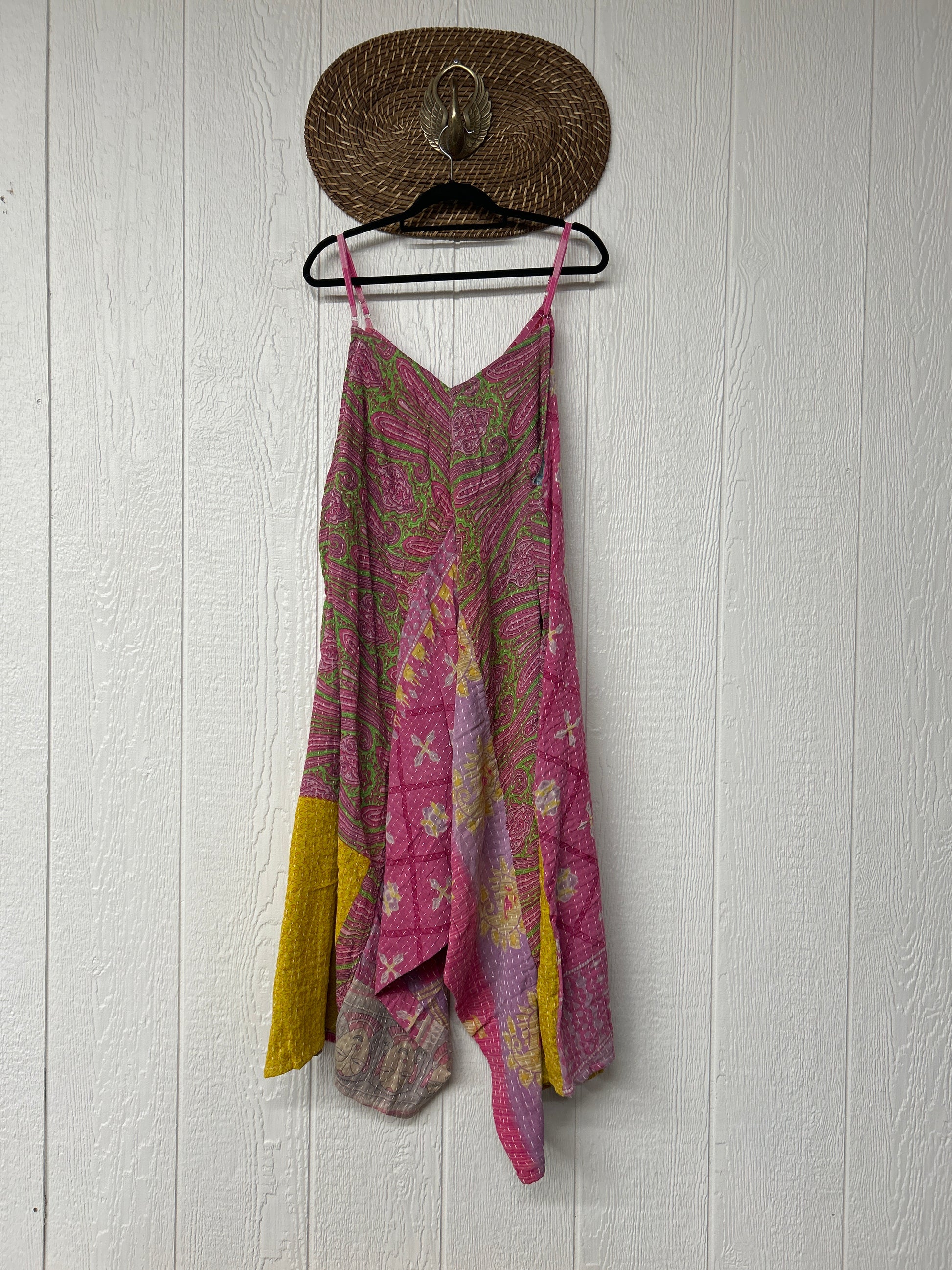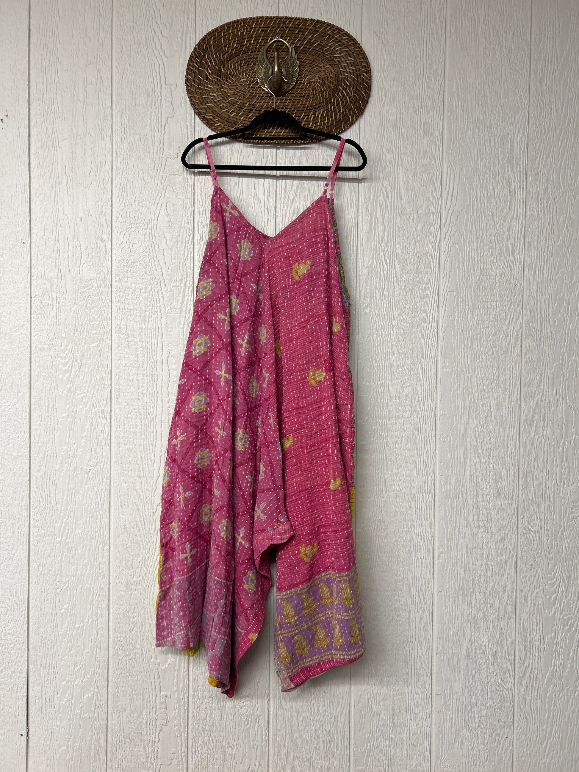 Crafted from vintage cotton kantha stitched sari this fully reversible jumpsuit features interior pockets, adjustable straps, wide legs & a double v neckline.