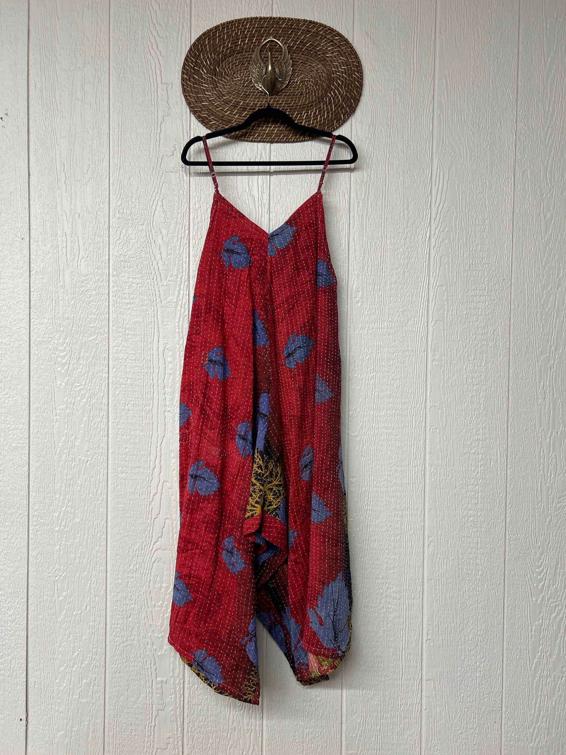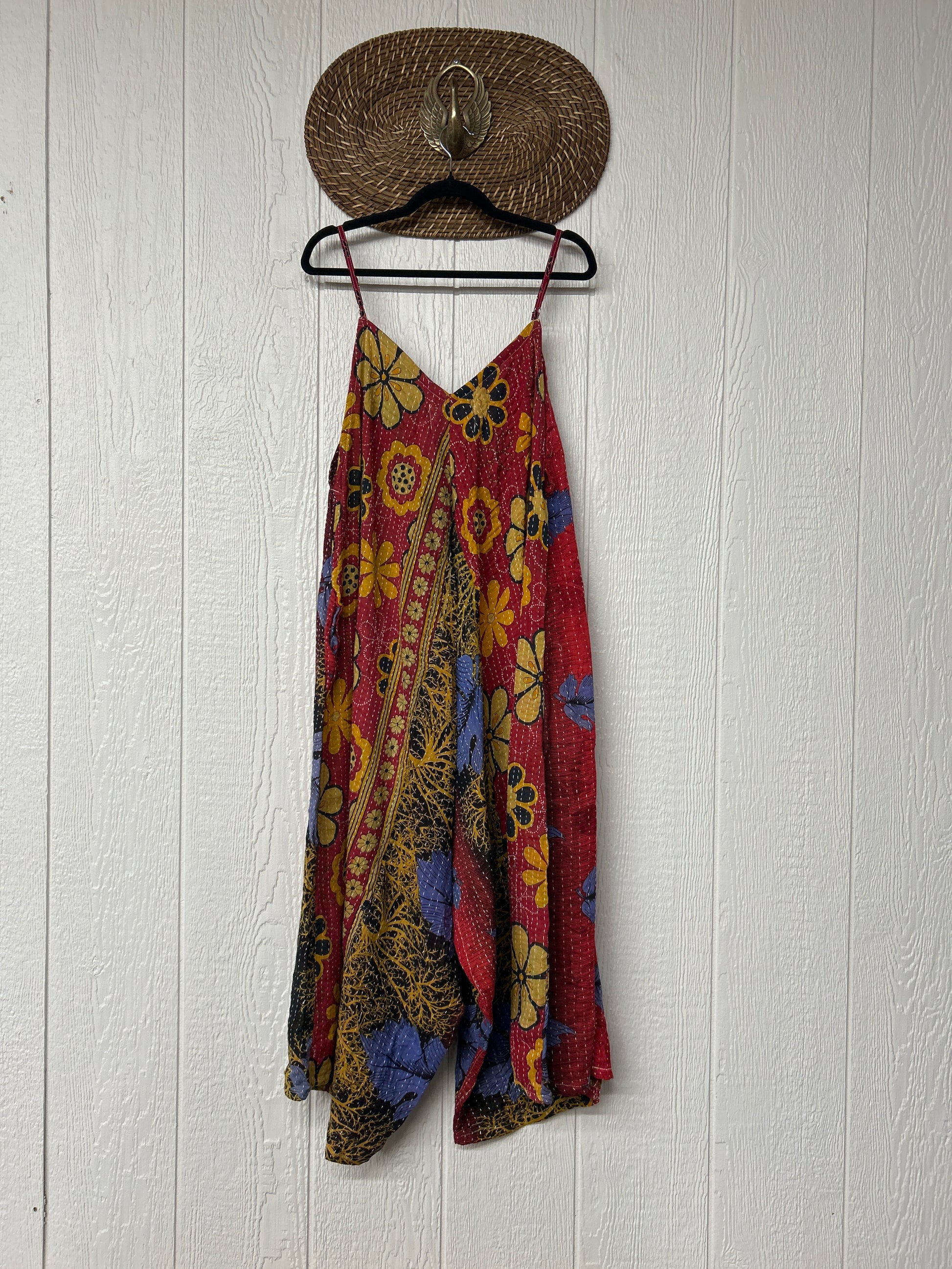 Crafted from vintage cotton kantha stitched sari this fully reversible jumpsuit features interior pockets, adjustable straps, wide legs & a double v neckline.