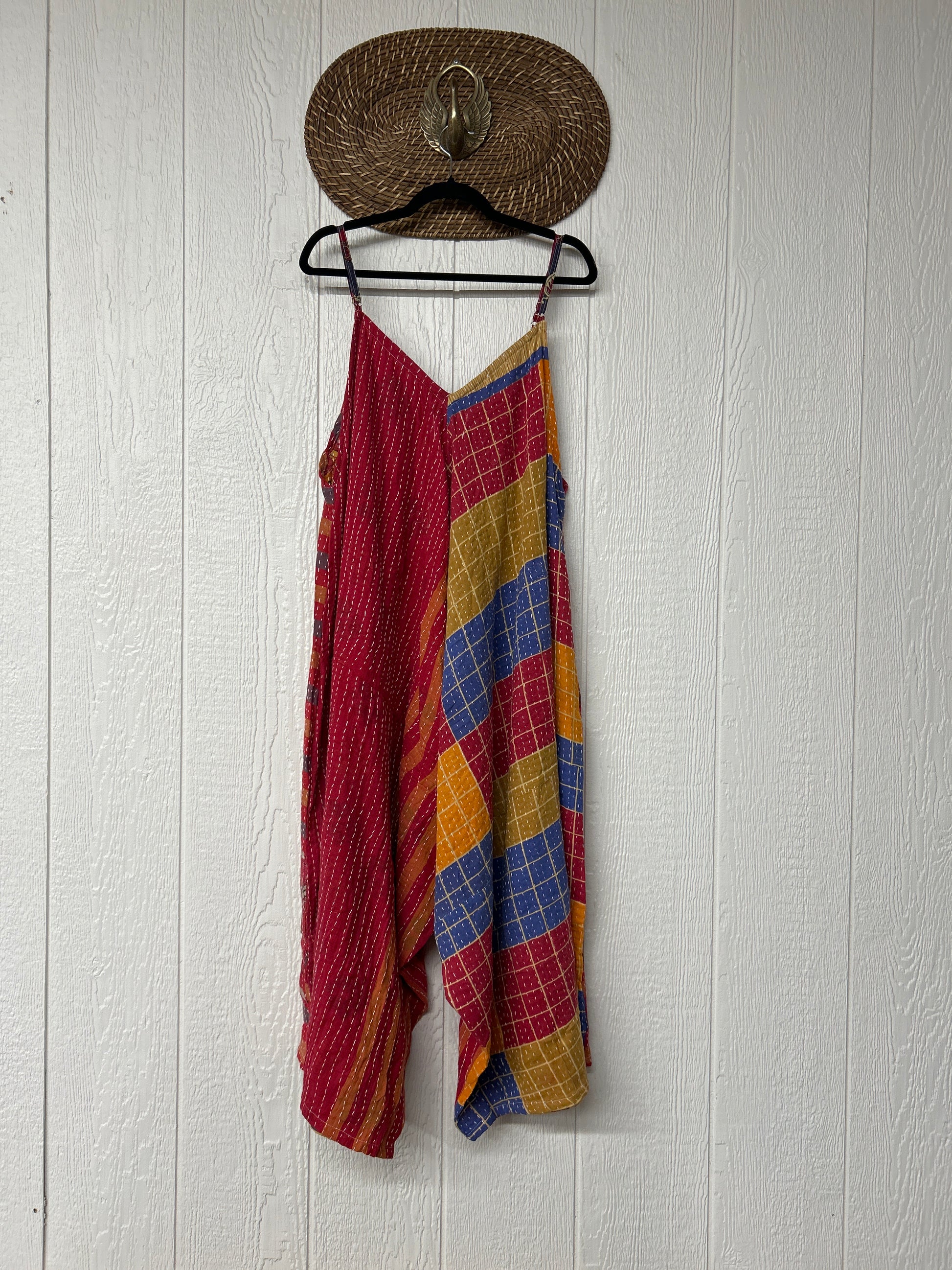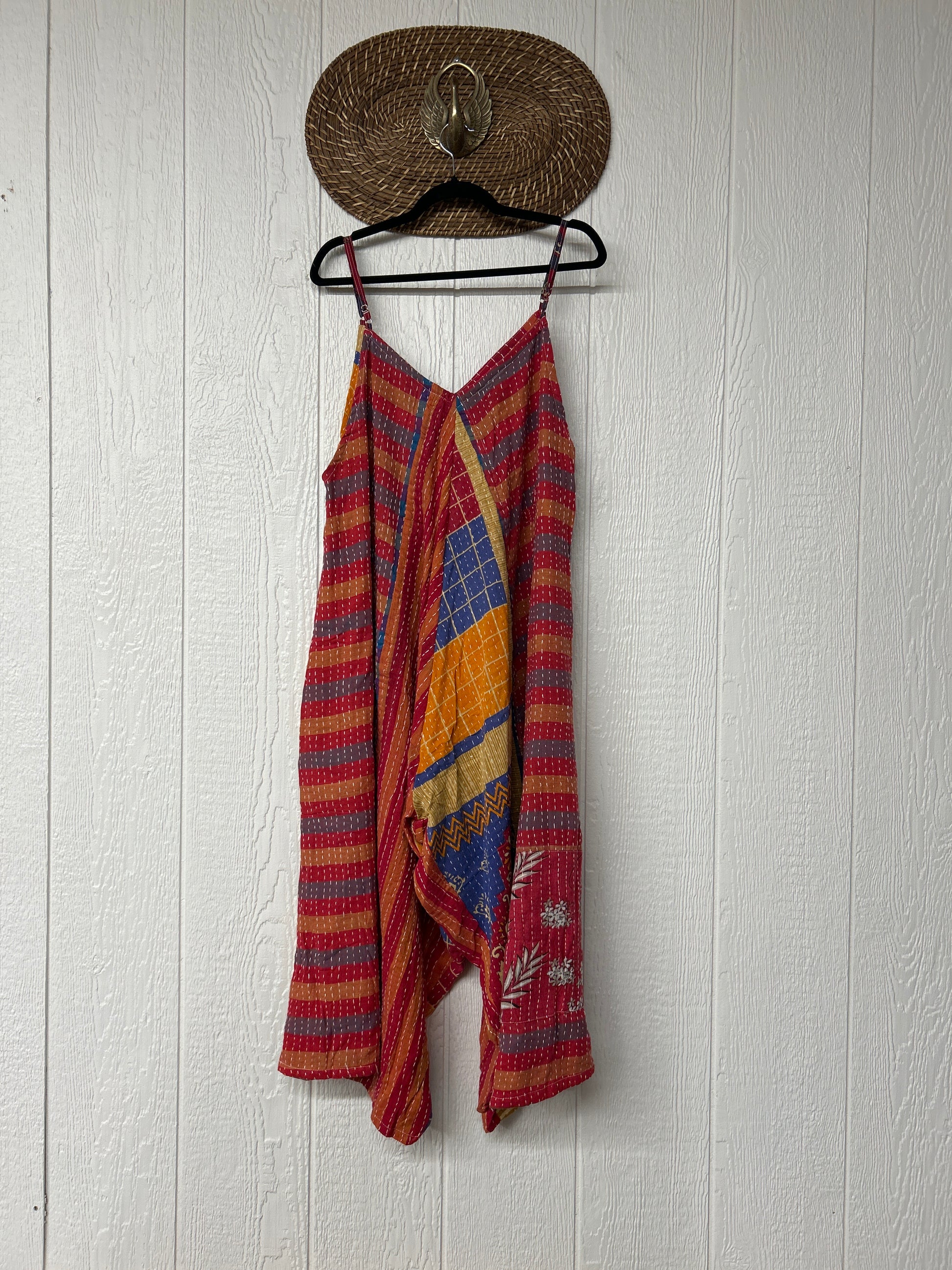 Crafted from vintage cotton kantha stitched sari this fully reversible jumpsuit features interior pockets, adjustable straps, wide legs & a double v neckline.