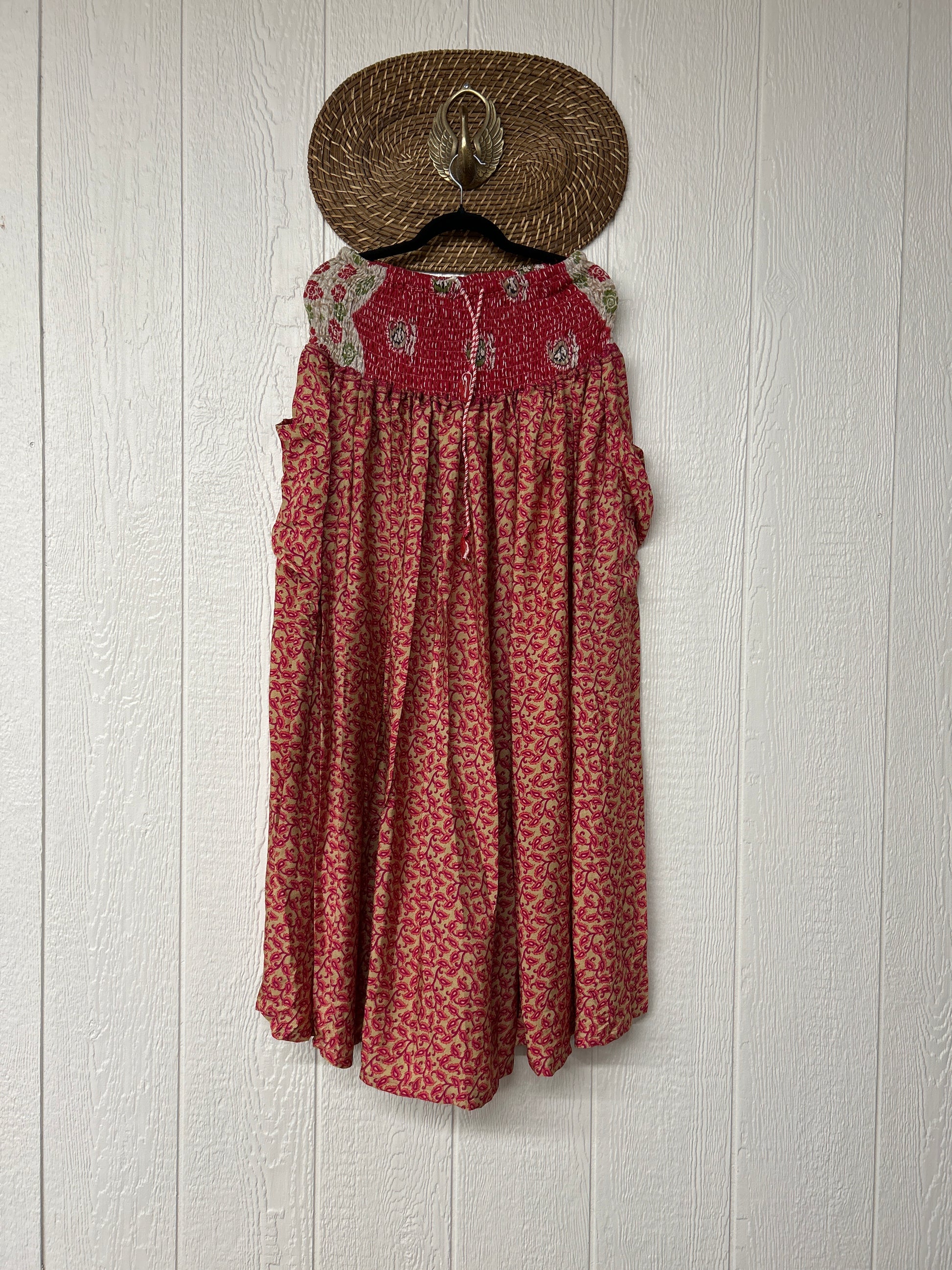 Made from our vintage rasgulla sari, this versatile piece features a smocked band at the waist to wear as a maxi dress or midi skirt. Our convertible maxi dress has two deep exterior pockets and a drawstring waist in a stretchy Kantha waistband in the middle for extra versatility. One Size, recommended up to a size 26. Crafted and sewn by families in a small village in Northern India, providing work and a fair living.