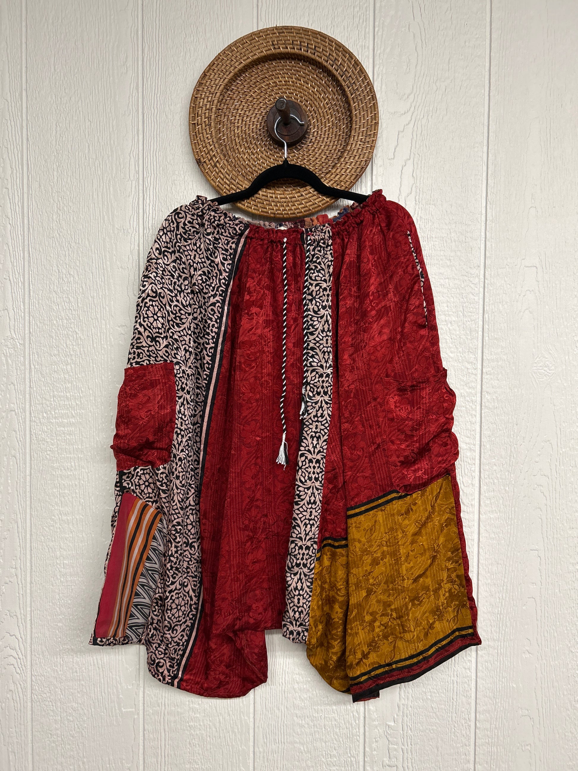 Fabrics may have small threads or holes in the layers. Color inconsistency or small stains may be present. The saris are sewn together and extend the life of each design. Imperfections should be celebrated.