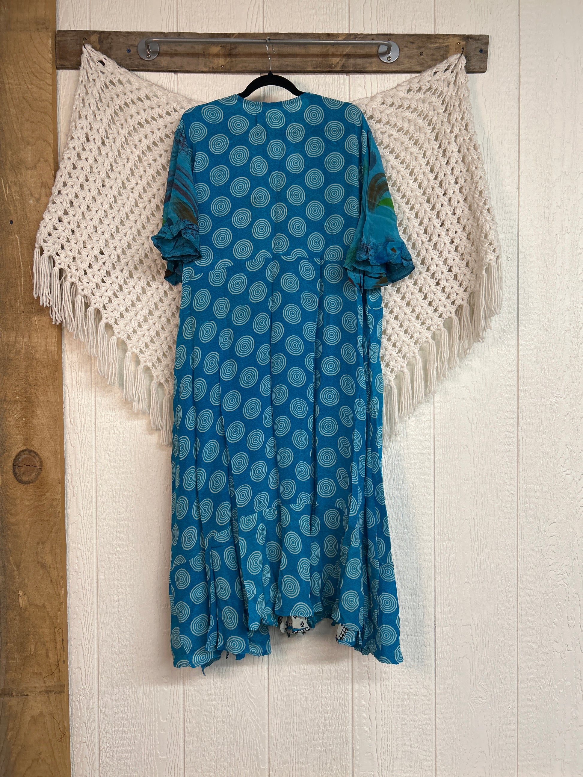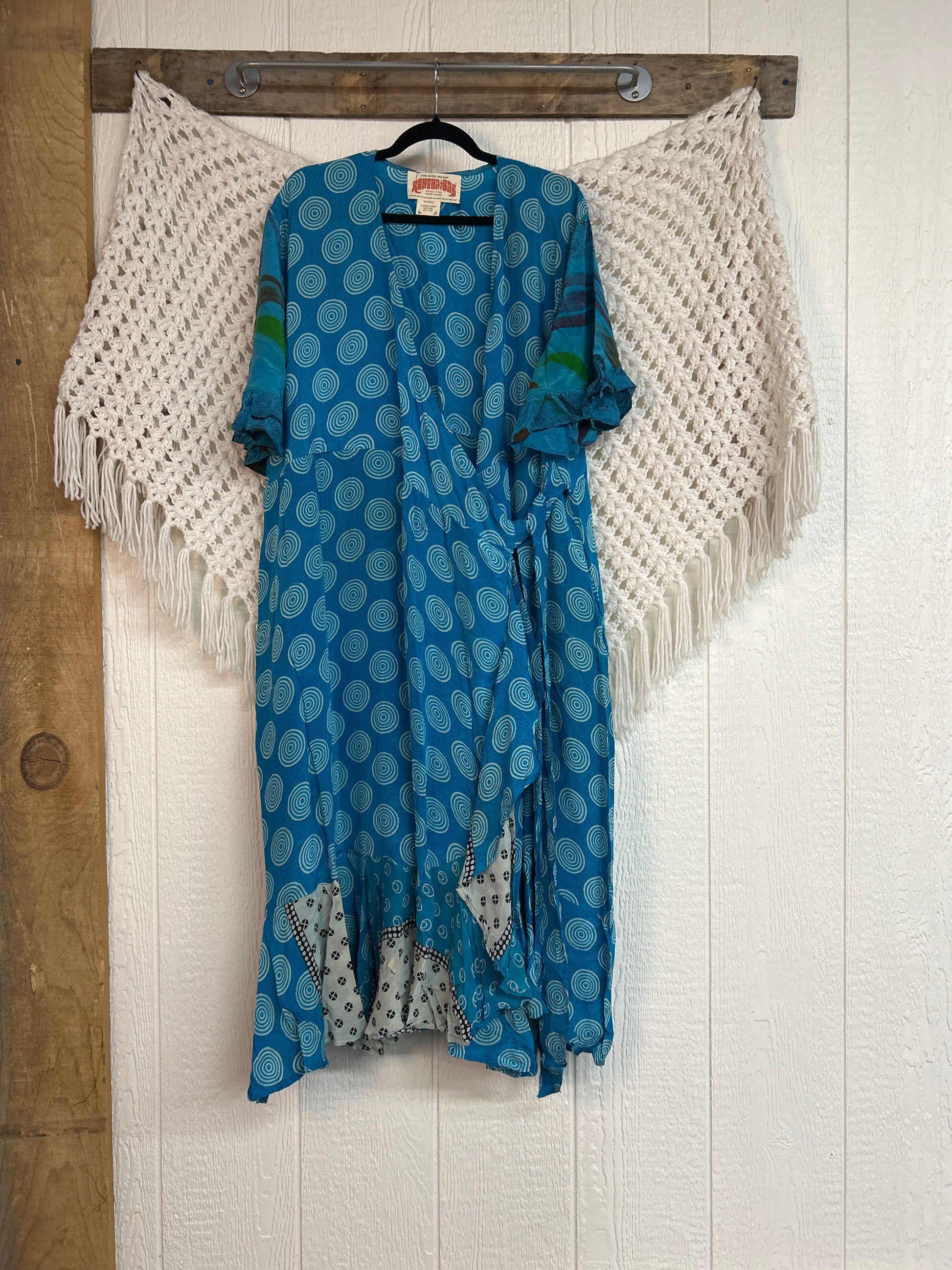 The Summer Flourish Wrap Dress is crafted from our ultra lux vintage crepe sari. Features short bell sleeves, ruffle details throughout and a built in sash belt which wraps around the body to make this beauty fully customizable for a wide range of sizes. You can also wear the Flourish open as a vibey kimono over your favorite outfit. We're obsessed!