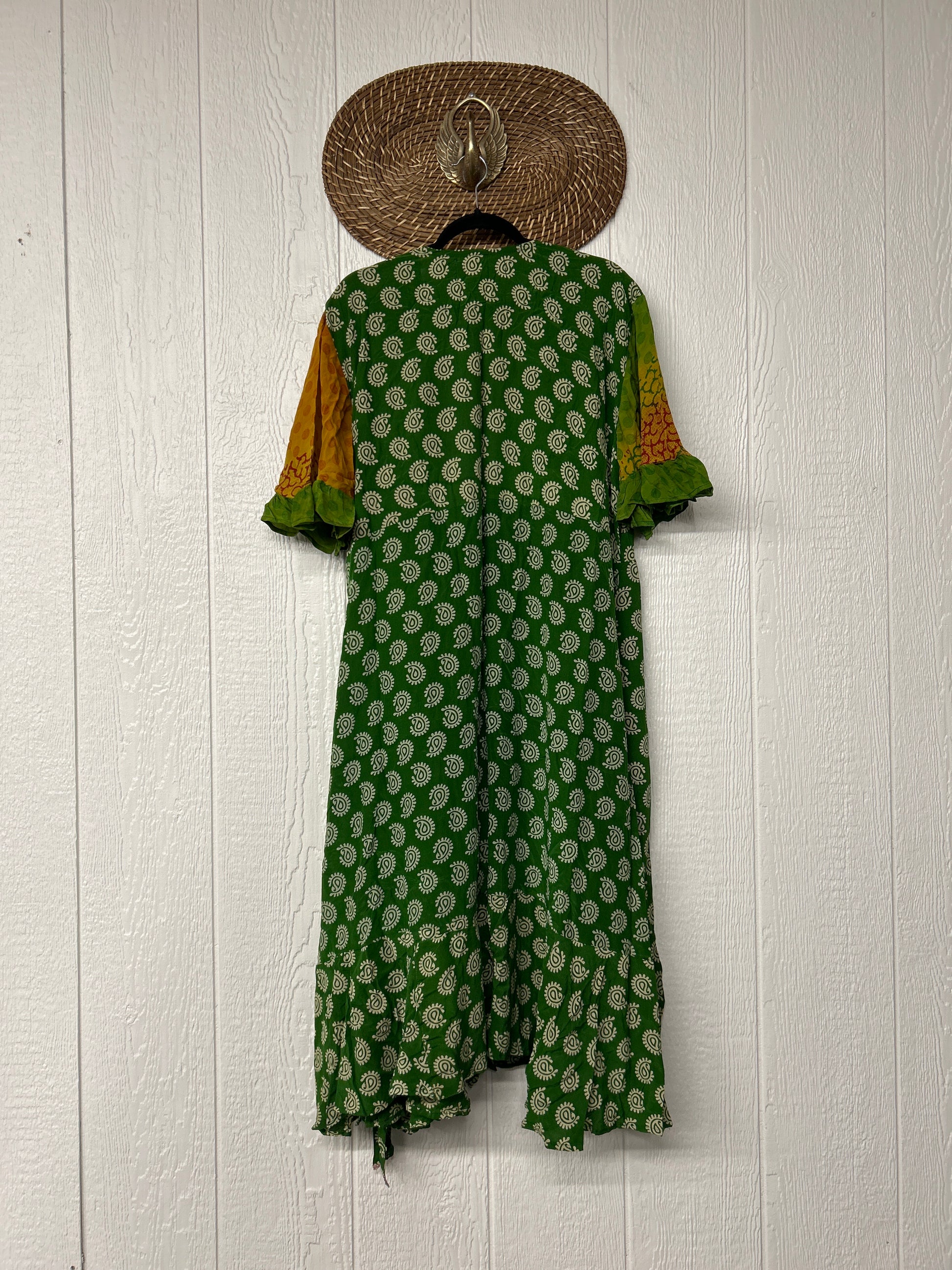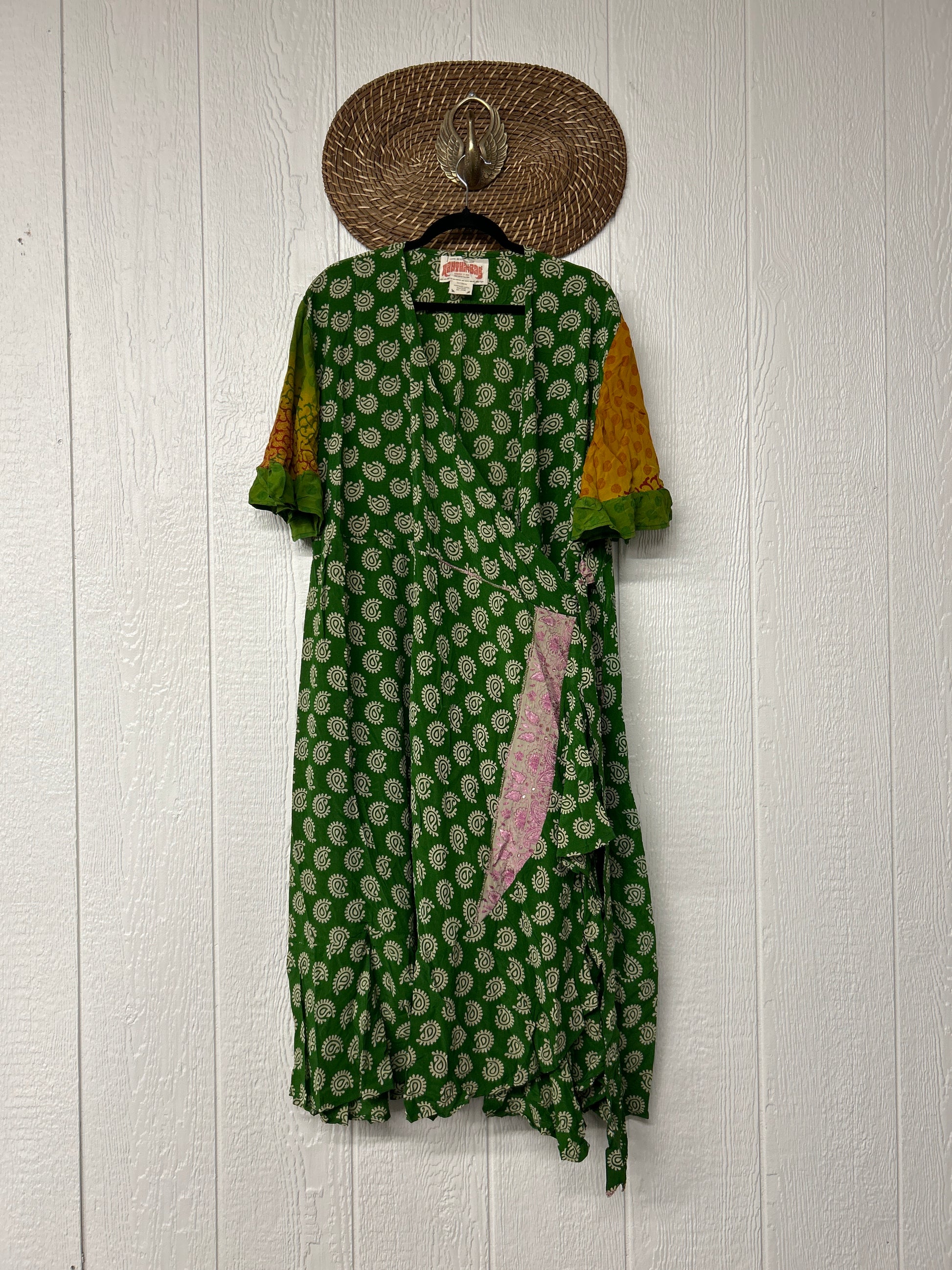 The Summer Flourish Wrap Dress is crafted from our ultra lux vintage crepe sari. Features short bell sleeves, ruffle details throughout and a built in sash belt which wraps around the body to make this beauty fully customizable for a wide range of sizes. You can also wear the Flourish open as a vibey kimono over your favorite outfit. We're obsessed!