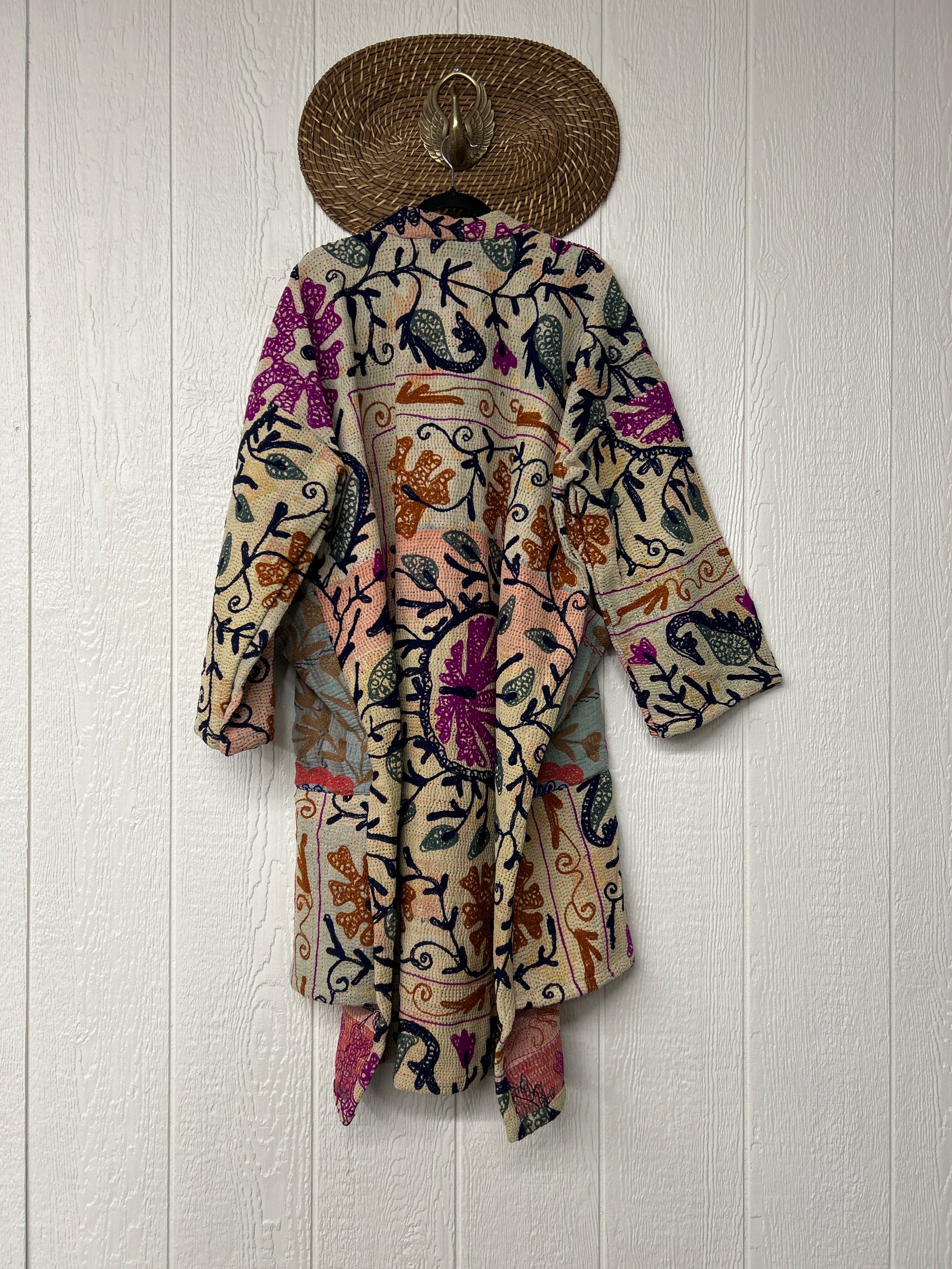 Crafted from hand embroidered fine kantha features slouchy exterior pockets, an open front silhouette with a slight high low hem for extra dimension.