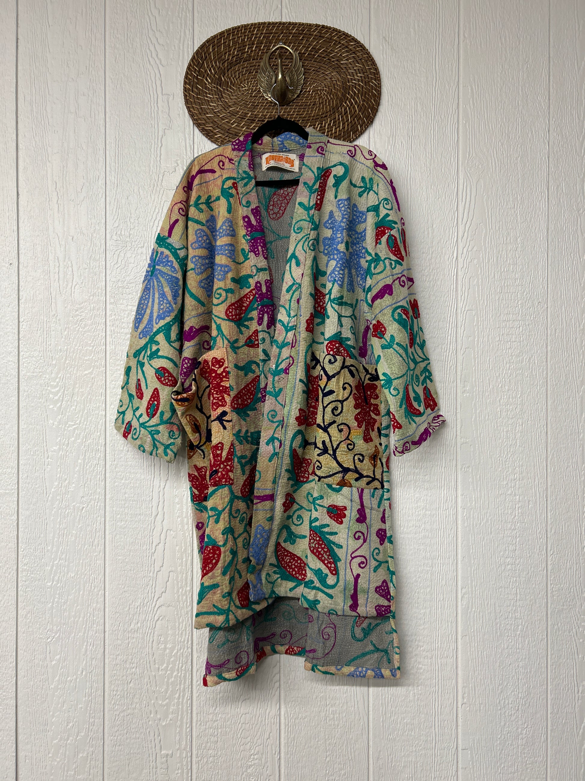 Crafted from hand embroidered fine kantha features slouchy exterior pockets, an open front silhouette with a slight high low hem for extra dimension.