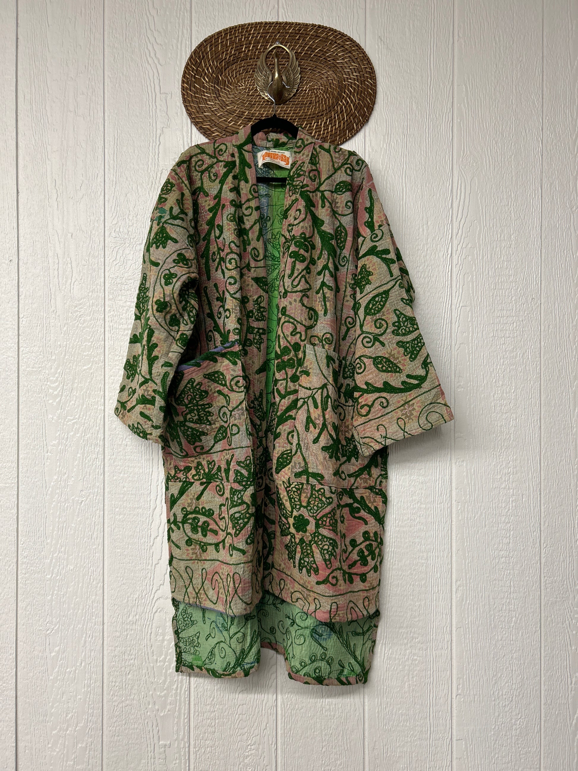Crafted from hand embroidered fine kantha features slouchy exterior pockets, an open front silhouette with a slight high low hem for extra dimension.