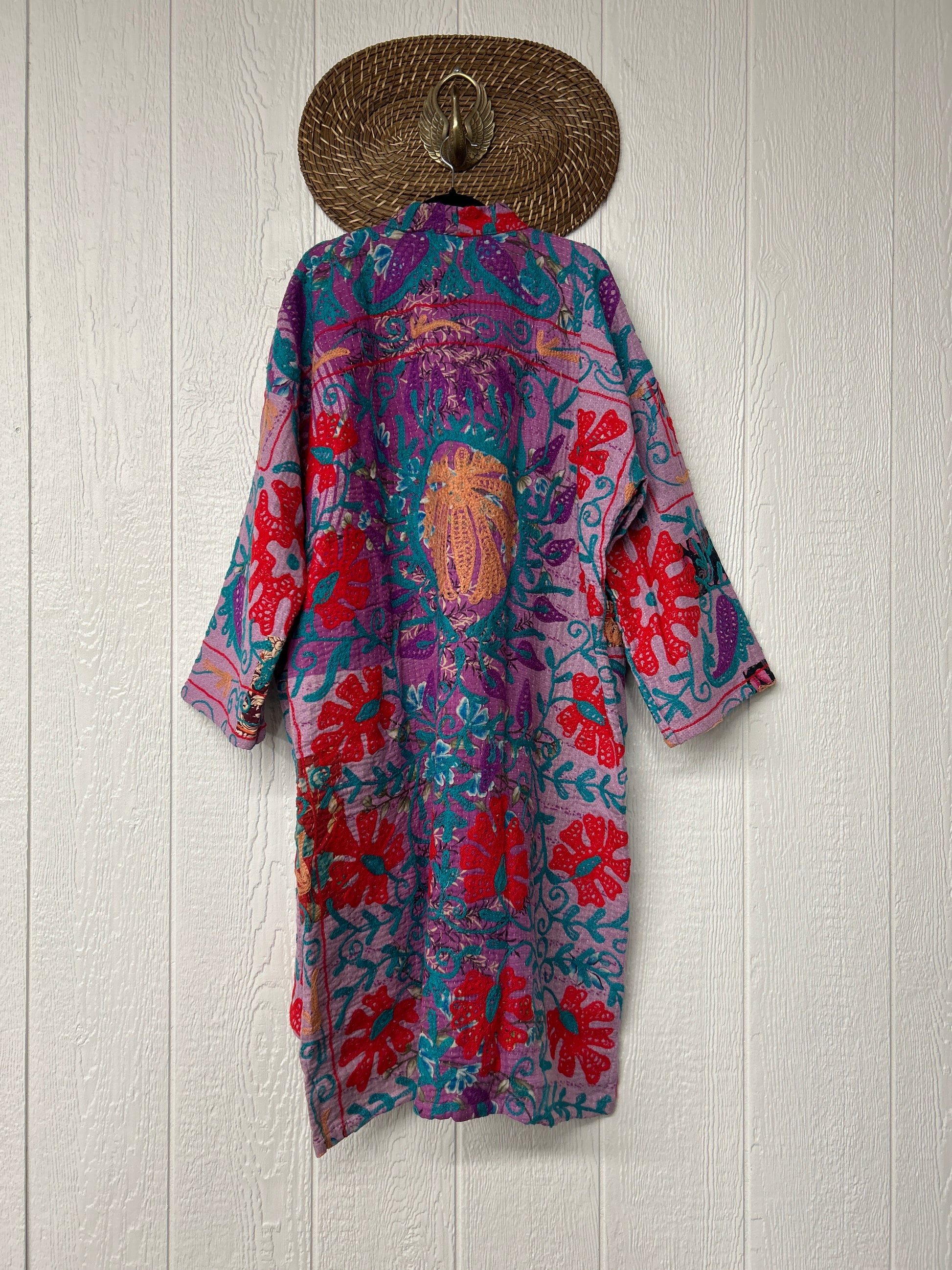 Crafted from hand embroidered fine kantha features slouchy exterior pockets, an open front silhouette with a slight high low hem for extra dimension.
