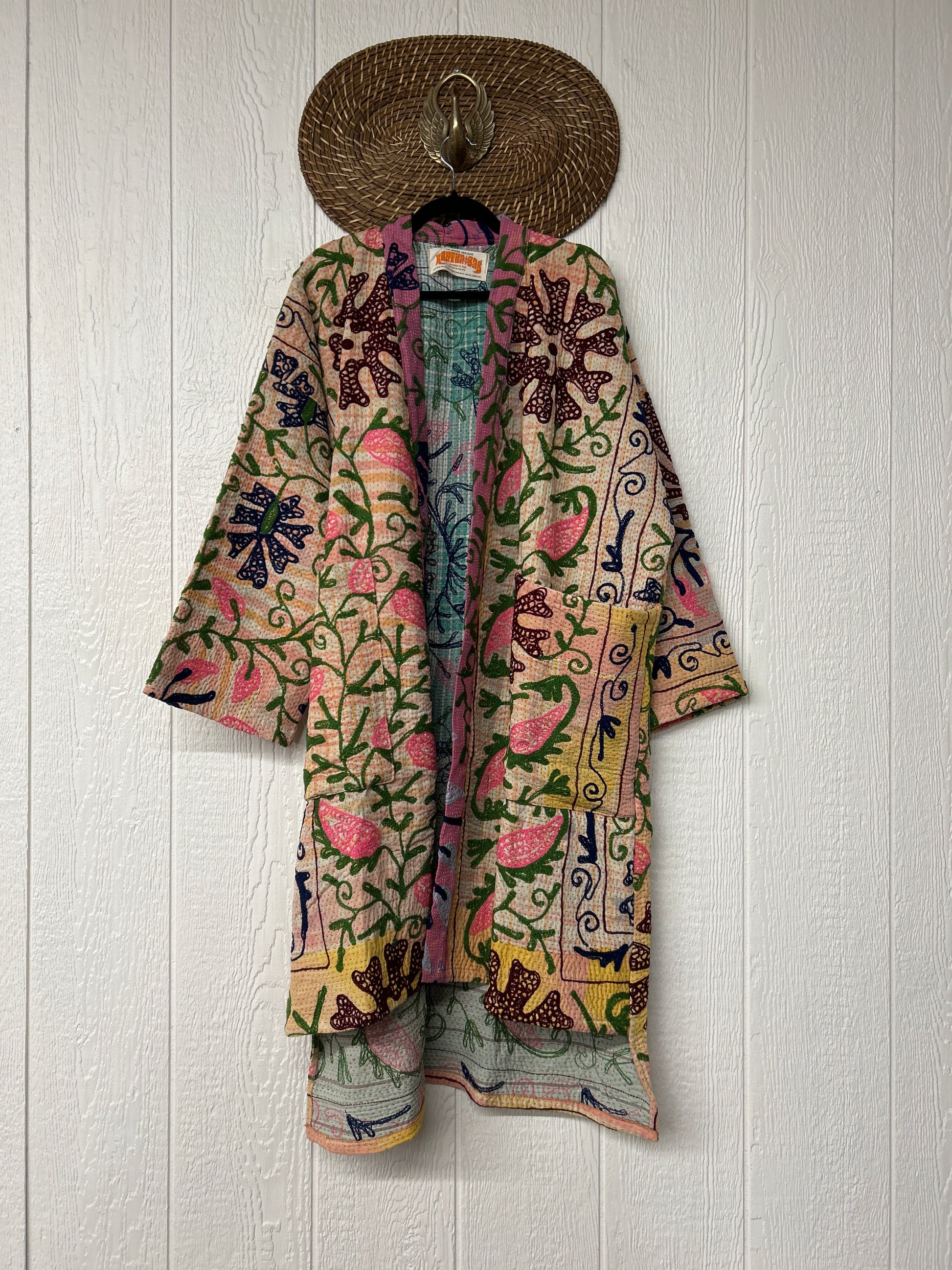 Crafted from hand embroidered fine kantha features slouchy exterior pockets, an open front silhouette with a slight high low hem for extra dimension.