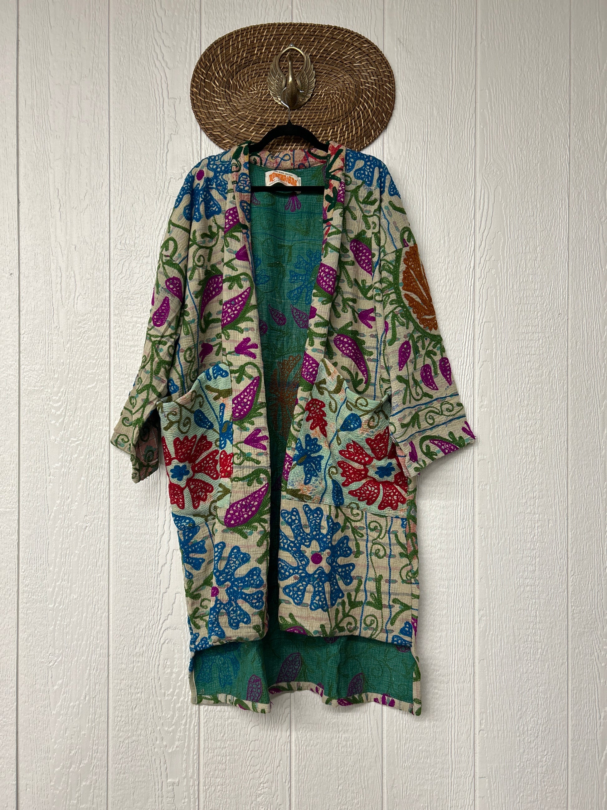 Crafted from hand embroidered fine kantha features slouchy exterior pockets, an open front silhouette with a slight high low hem for extra dimension.