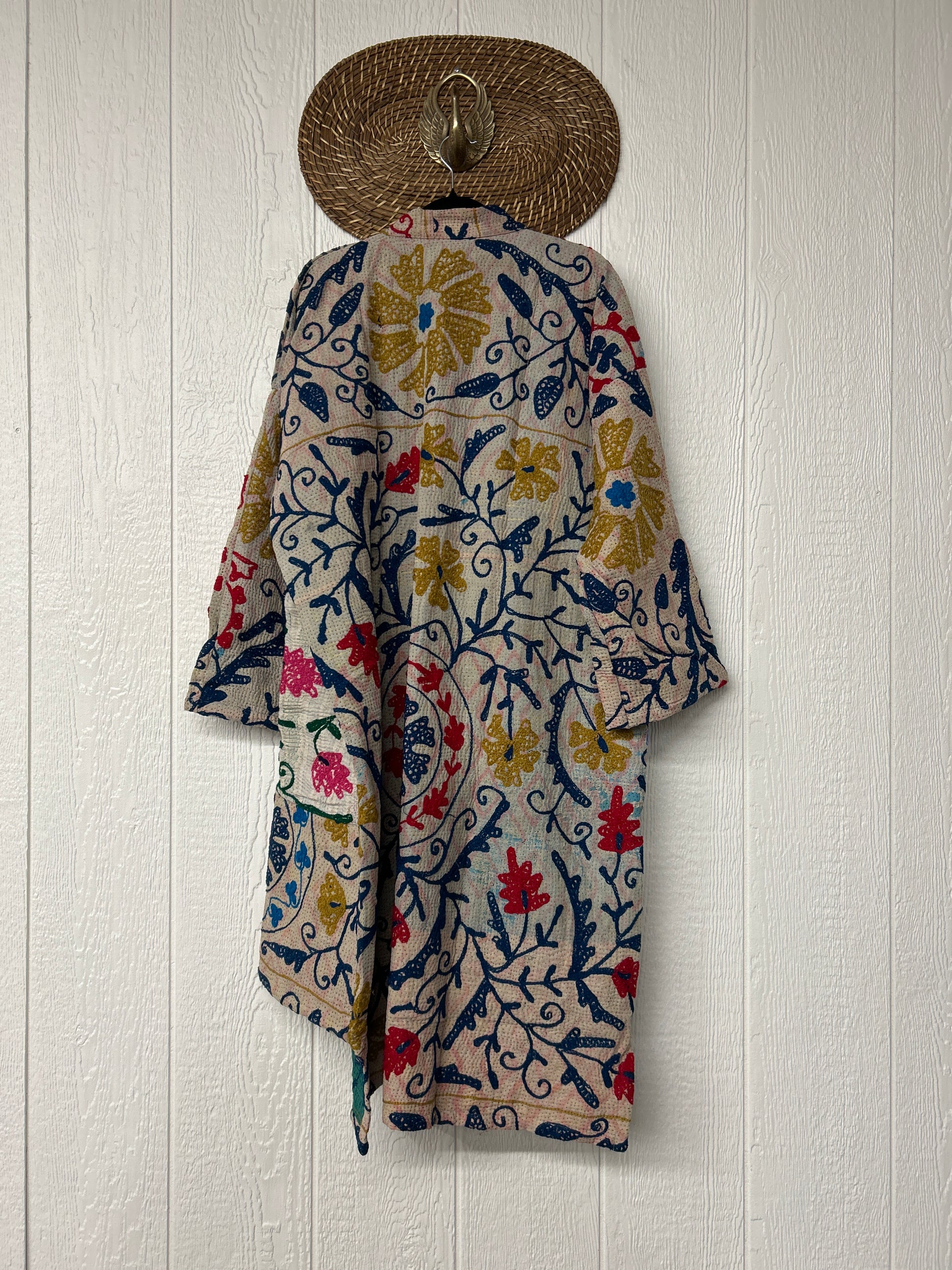 Crafted from hand embroidered fine kantha features slouchy exterior pockets, an open front silhouette with a slight high low hem for extra dimension.