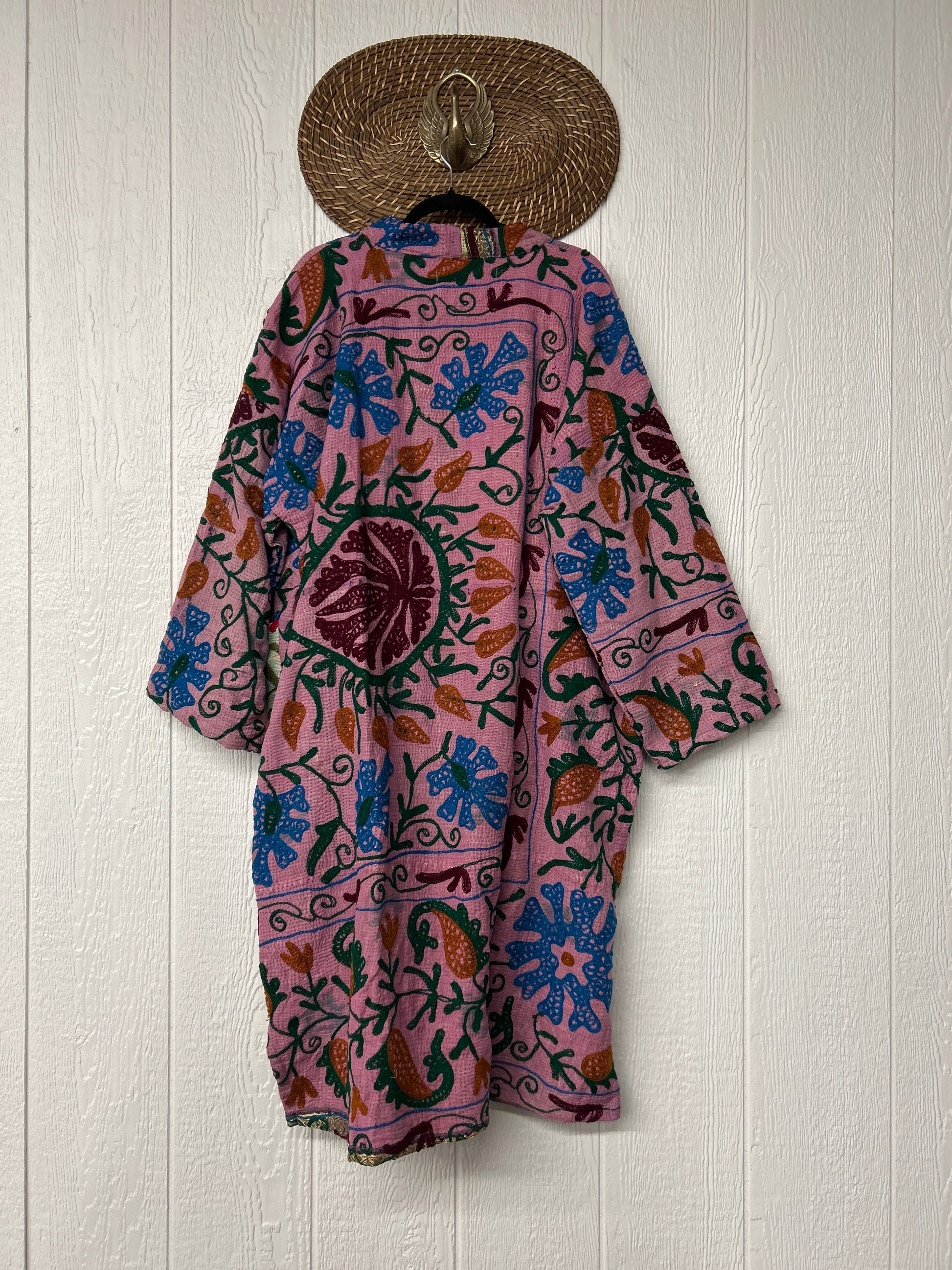 Crafted from hand embroidered fine kantha features slouchy exterior pockets, an open front silhouette with a slight high low hem for extra dimension.