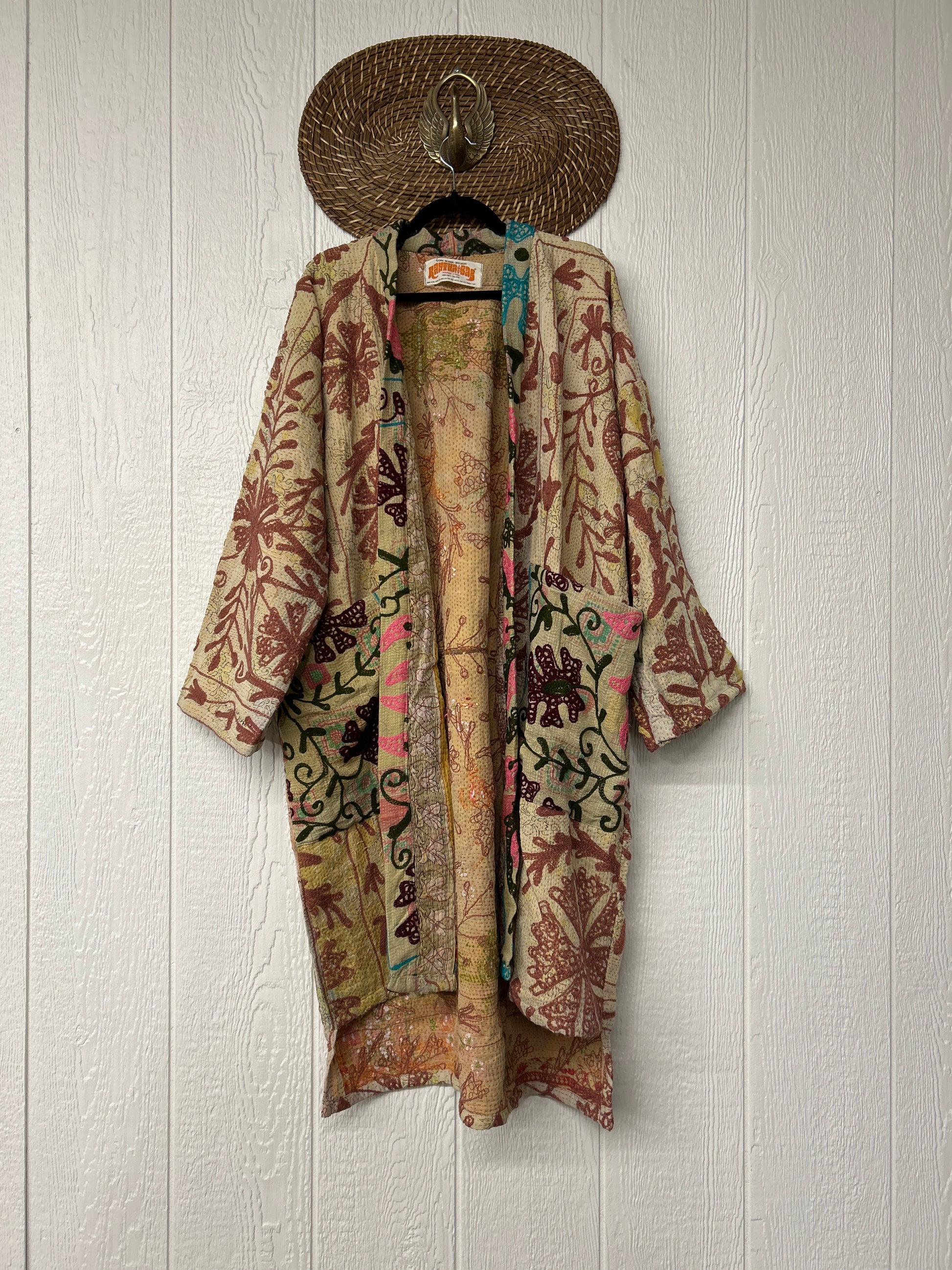 Crafted from hand embroidered fine kantha features slouchy exterior pockets, an open front silhouette with a slight high low hem for extra dimension.
