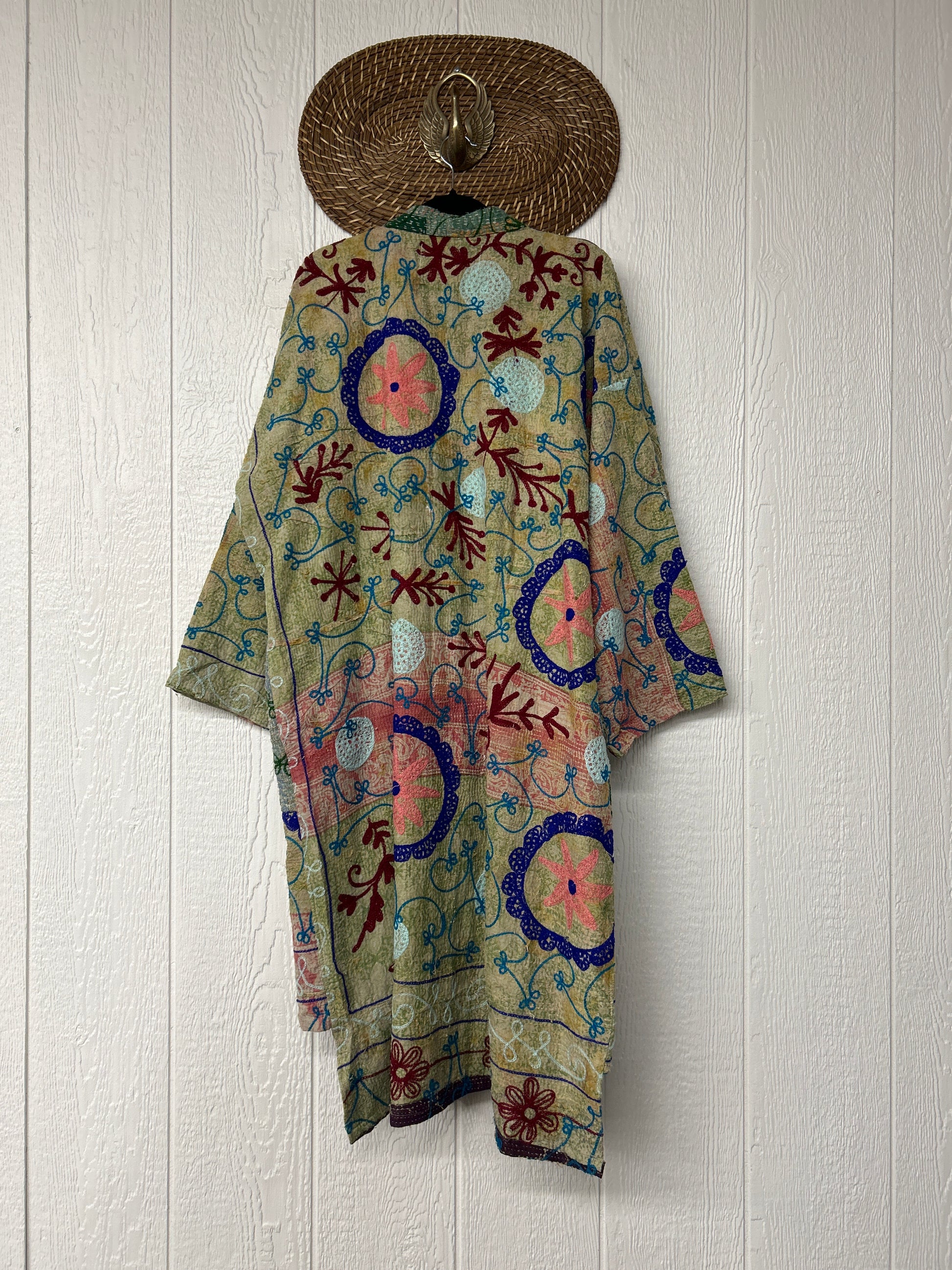 Crafted from hand embroidered fine kantha features slouchy exterior pockets, an open front silhouette with a slight high low hem for extra dimension.