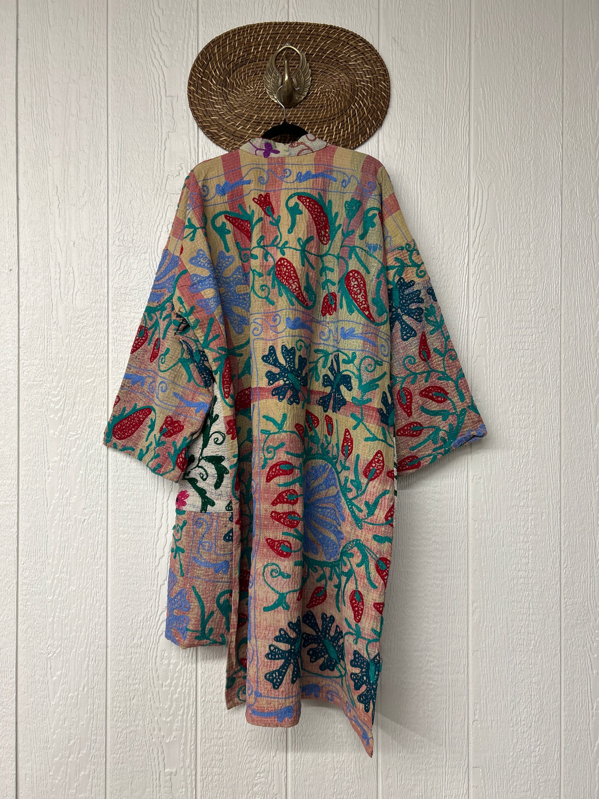 Crafted from hand embroidered fine kantha features slouchy exterior pockets, an open front silhouette with a slight high low hem for extra dimension.
