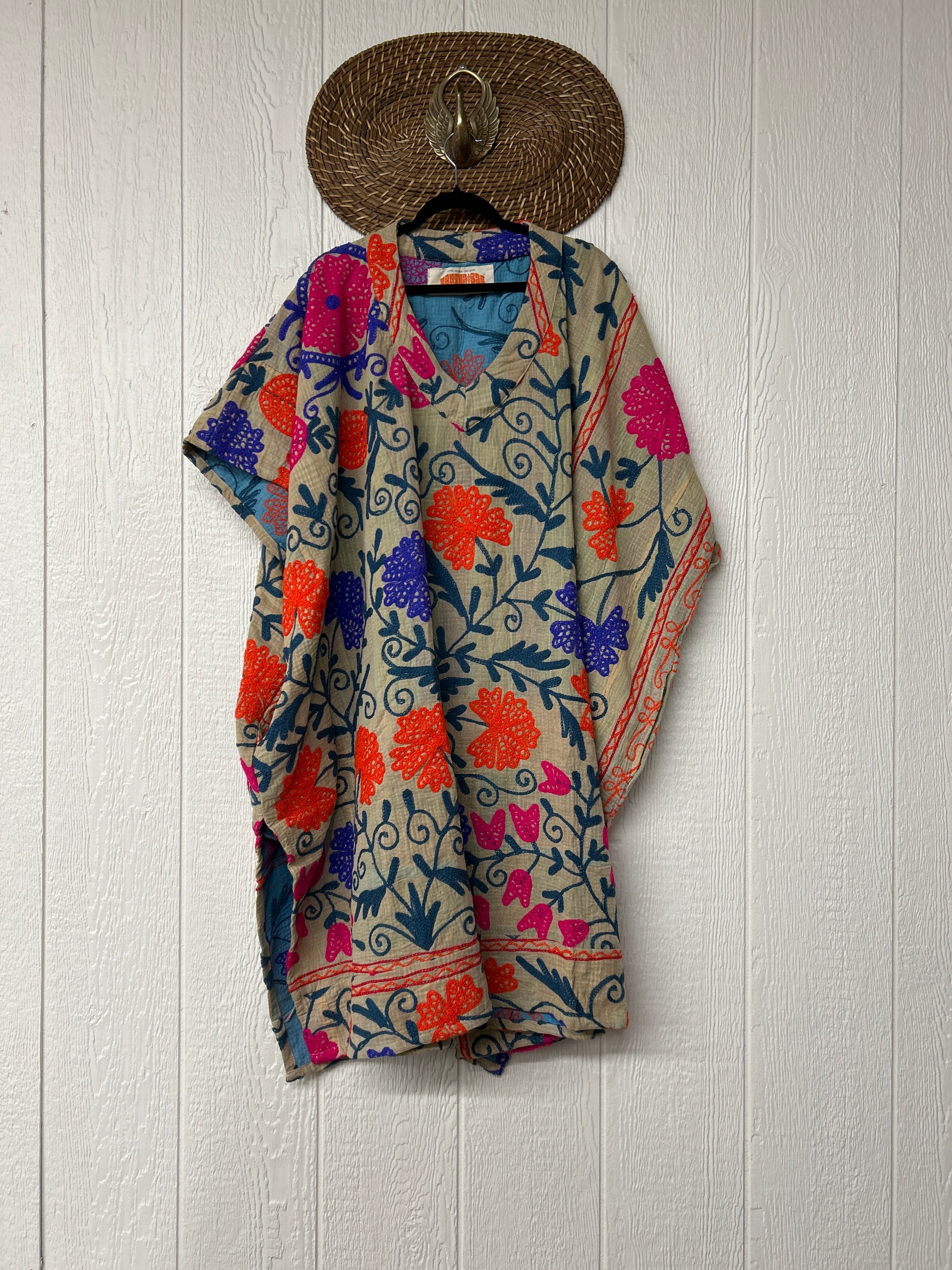 Crafted from hand embroidered fine kantha features a v neckline and interior pockets and side slits for extra dimension.