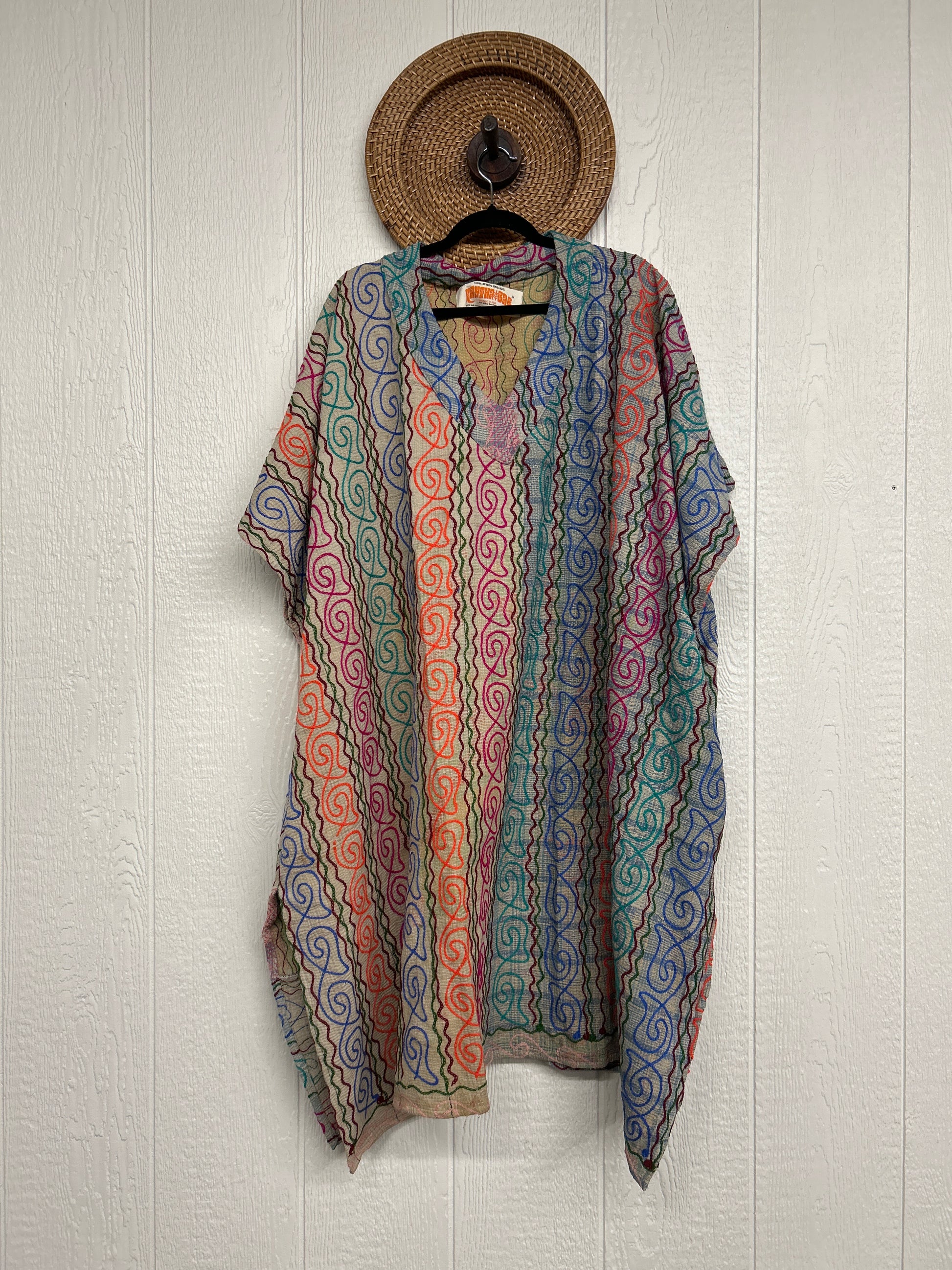 Crafted from hand embroidered fine kantha features a v neckline and interior pockets and side slits for extra dimension.