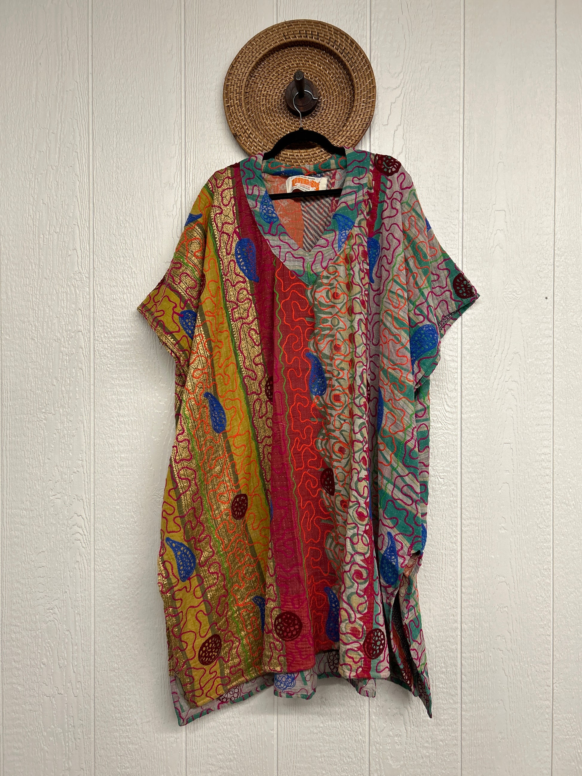 Crafted from hand embroidered fine kantha features a v neckline and interior pockets and side slits for extra dimension.