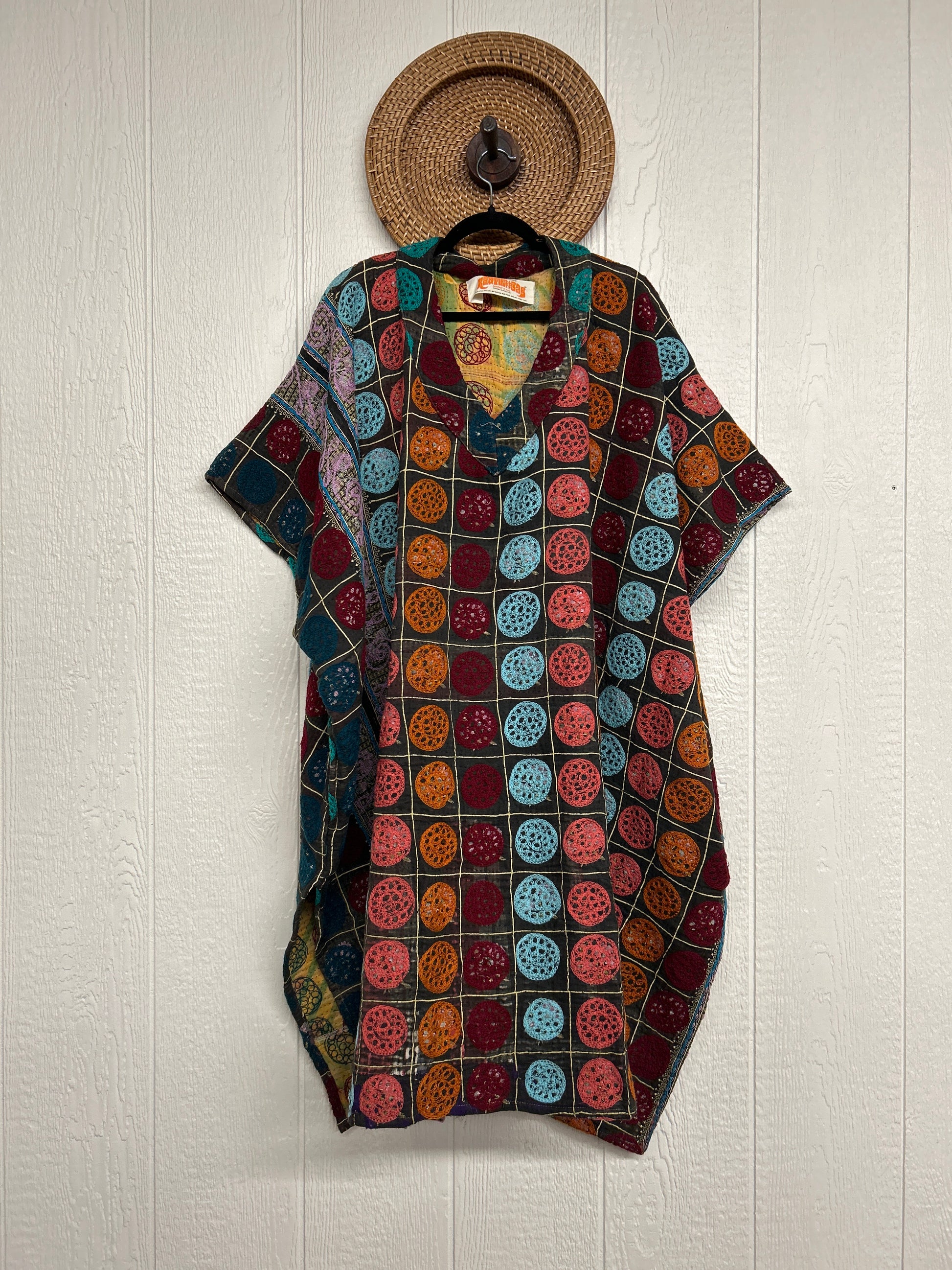 Crafted from hand embroidered fine kantha features a v neckline and interior pockets and side slits for extra dimension.