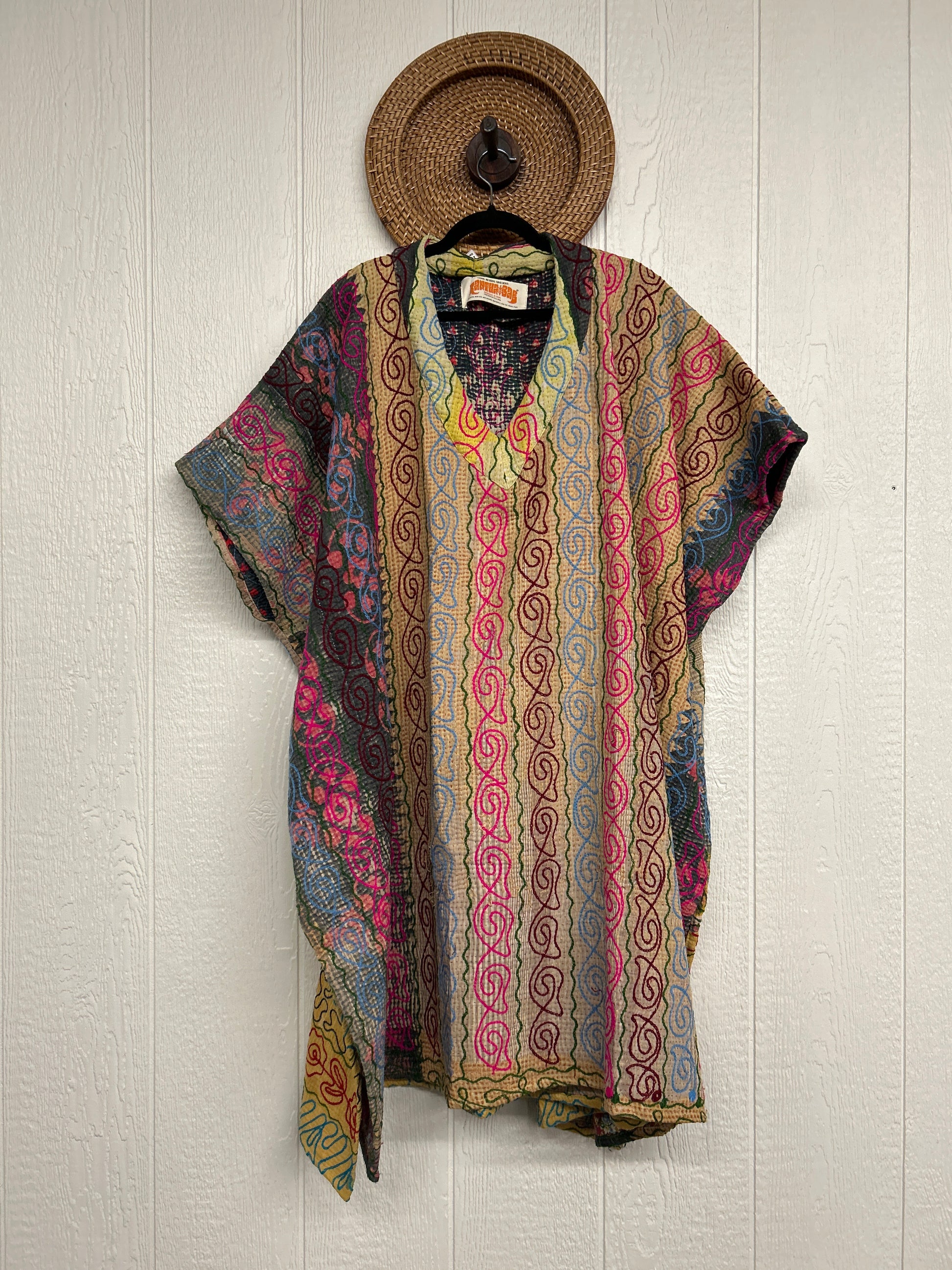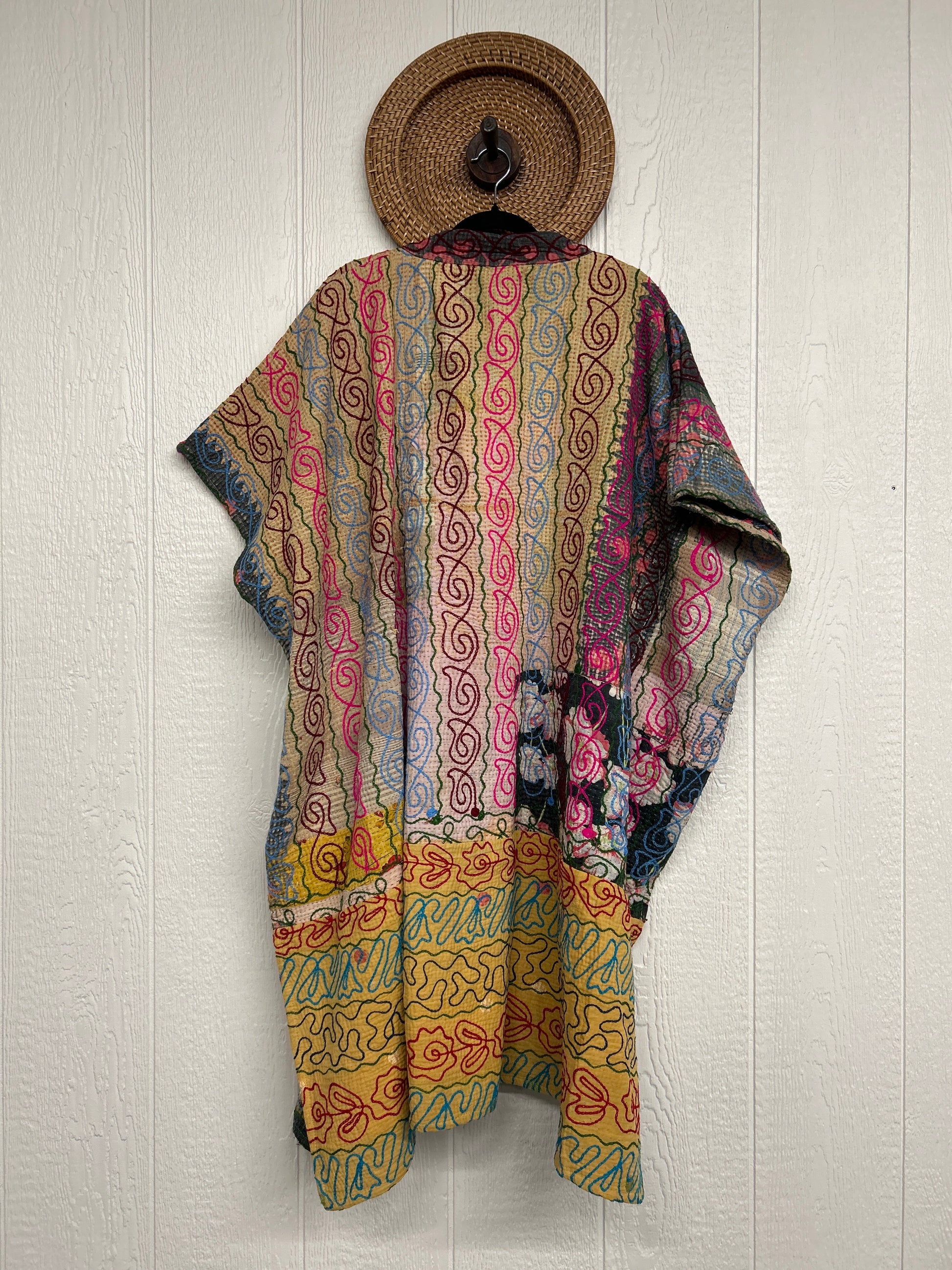 Crafted from hand embroidered fine kantha features a v neckline and interior pockets and side slits for extra dimension.