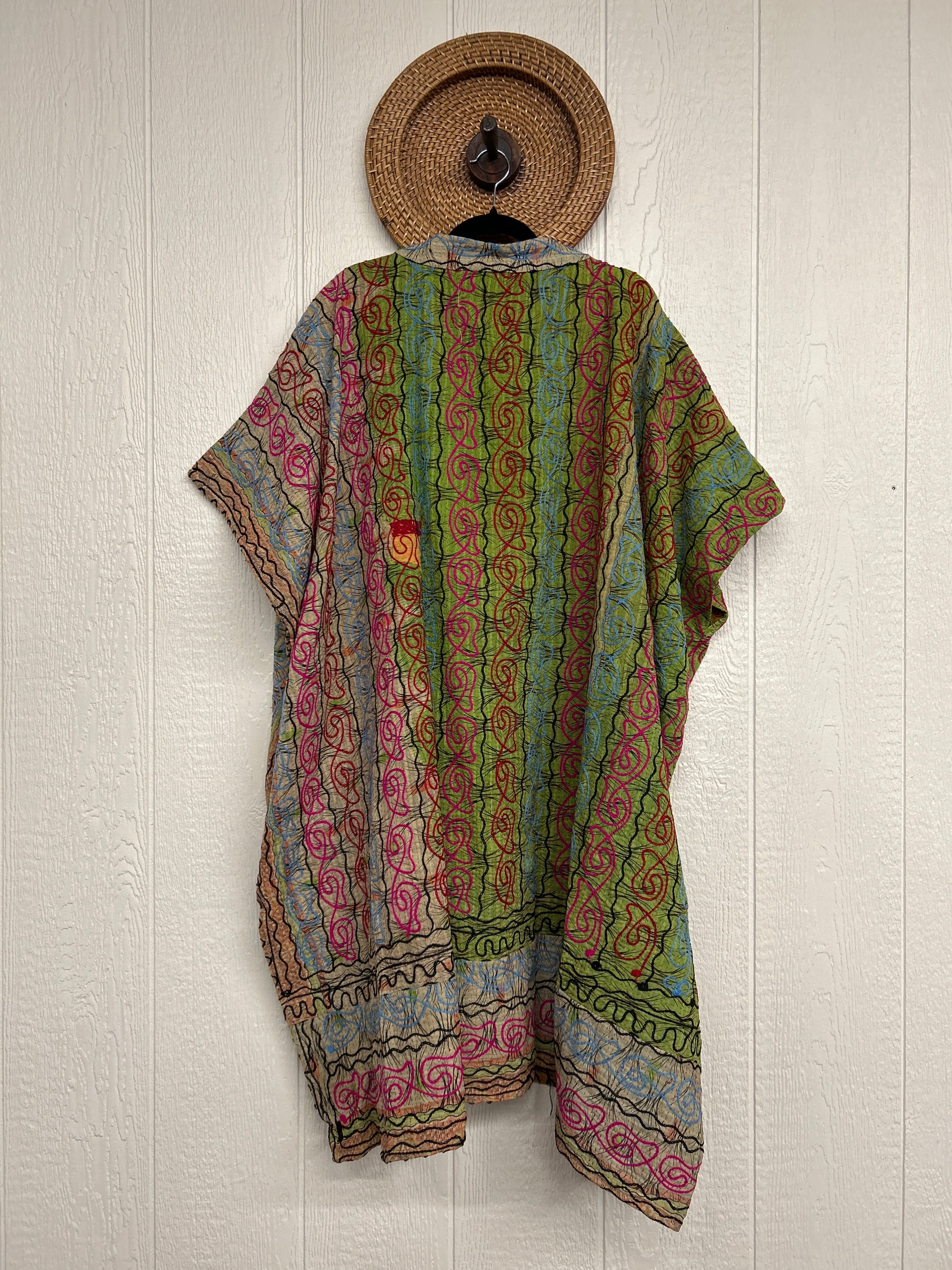 Crafted from hand embroidered fine kantha features a v neckline and interior pockets and side slits for extra dimension.