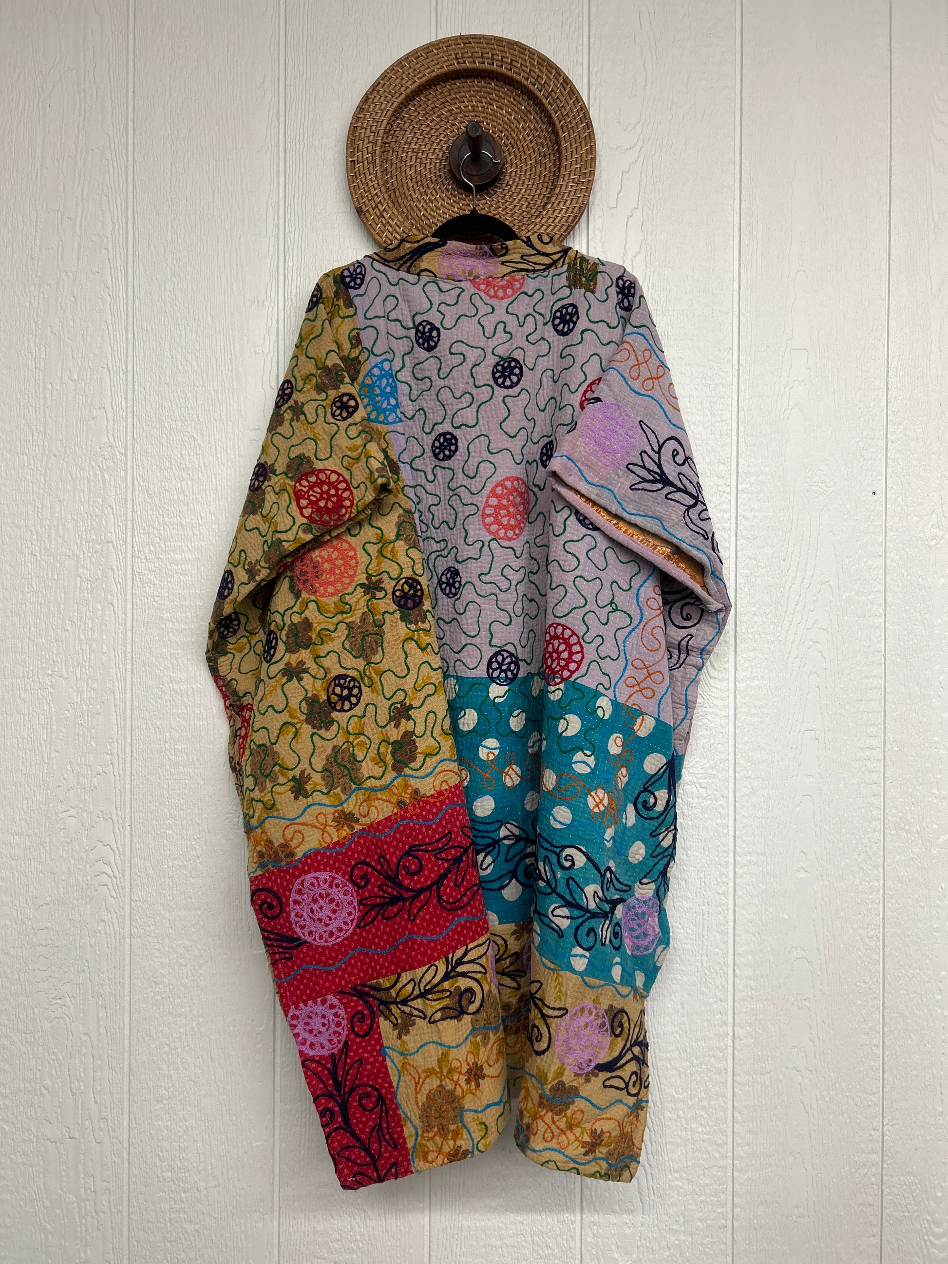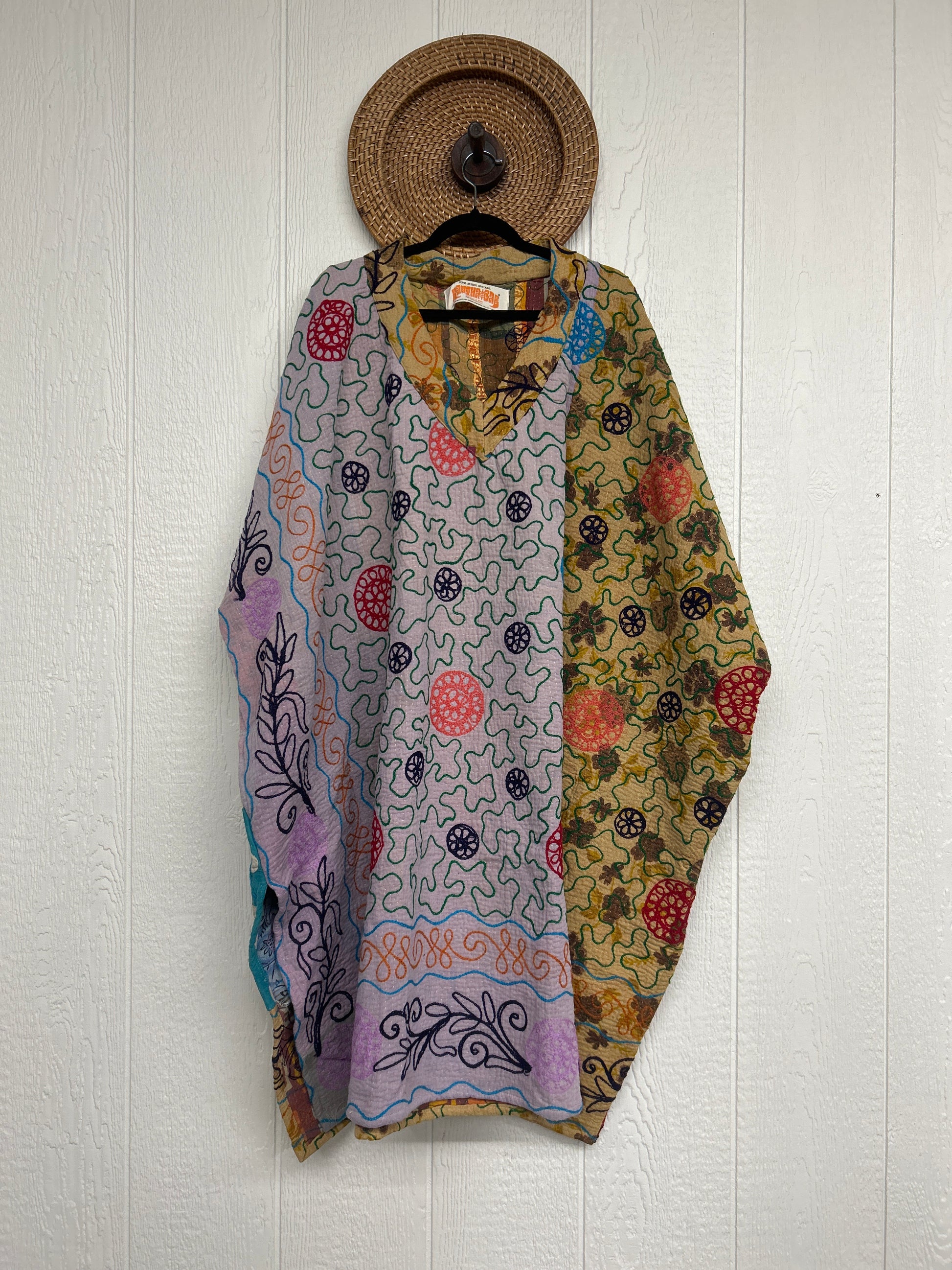 Crafted from hand embroidered fine kantha features a v neckline and interior pockets and side slits for extra dimension.