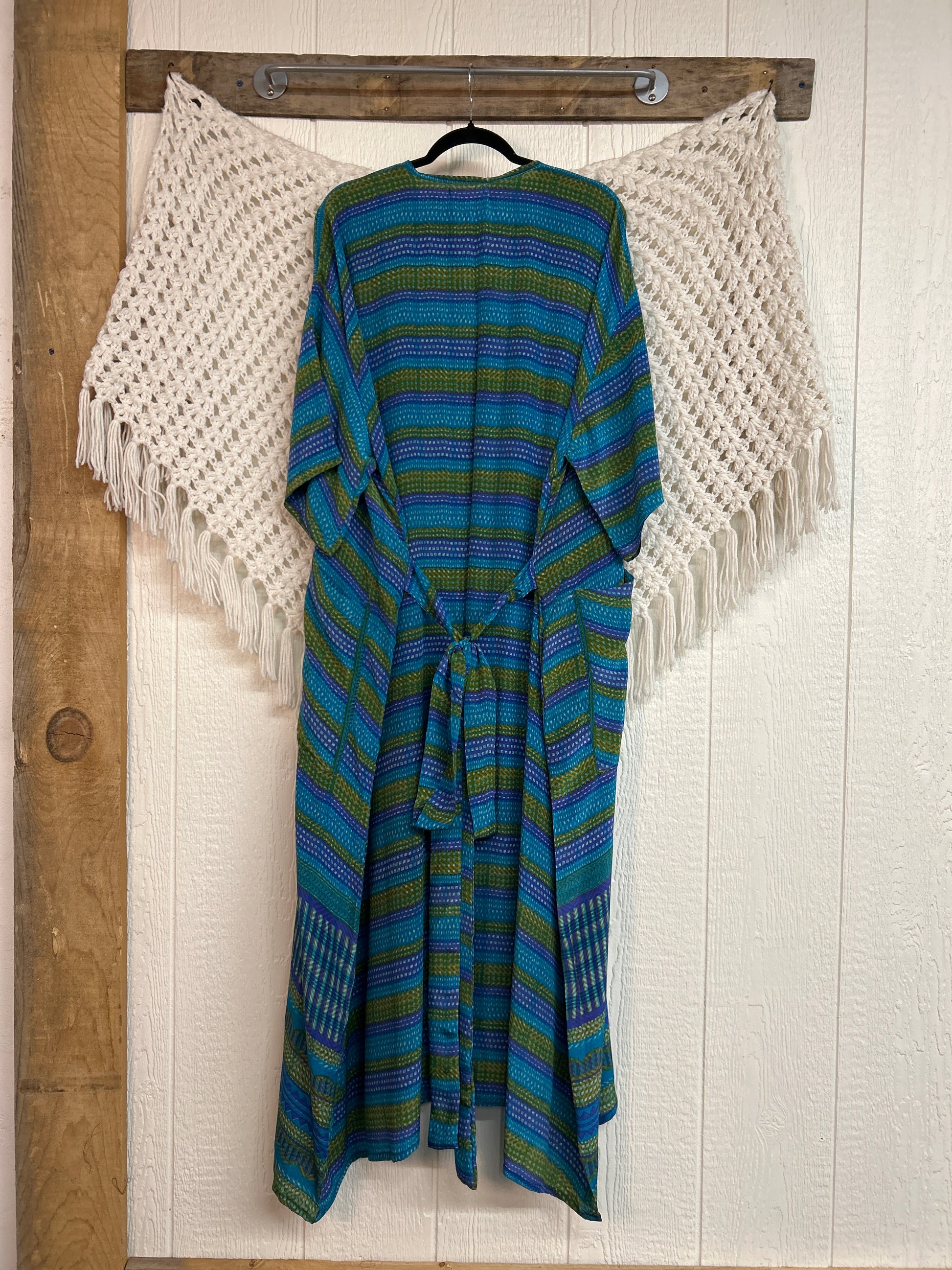 The Alchemy Duster is crafted from vintage crepe silk sari. It features slouchy exterior pockets and interior pockets, a tie closure that can fully wrap around the body to instantly transform into a wrap dress, wide short sleeves and an a-line silhouette we know you will love!