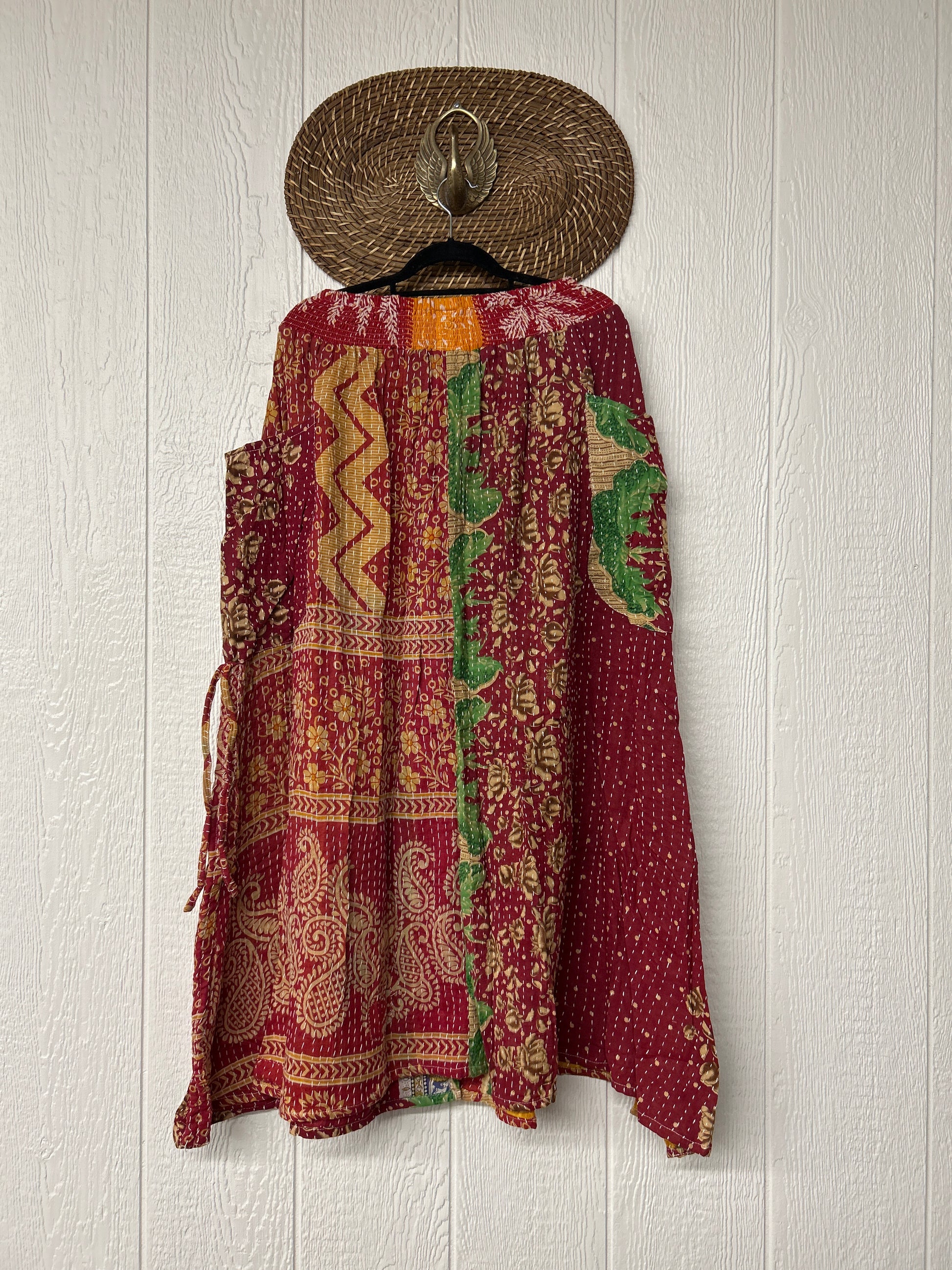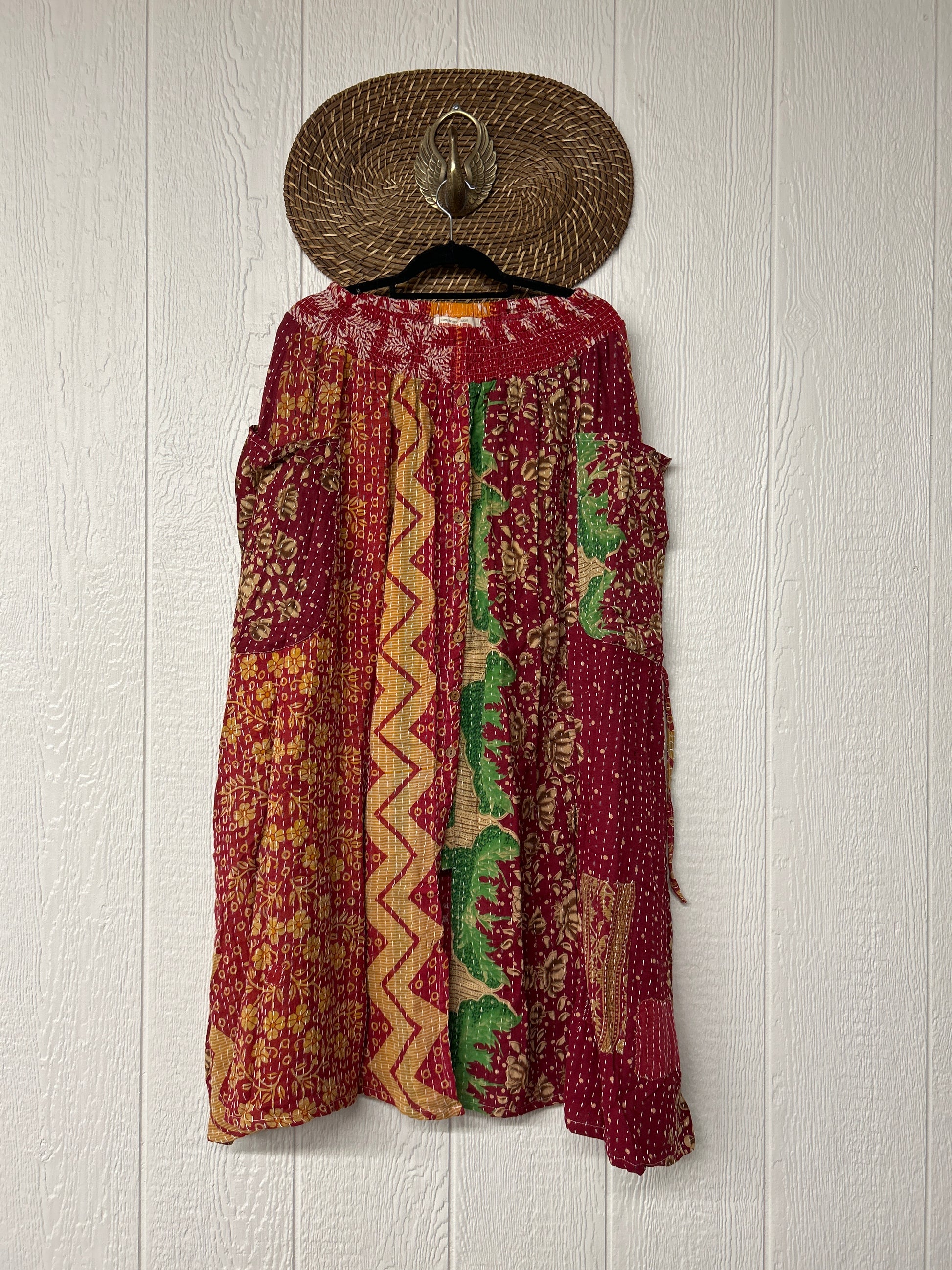 Crafted from kantha stitched vintage cotton sari this absolute dream features slouchy side pockets with a butterfly drawstring to cinch the sides, a button front skirt and a stretchy free size waist.