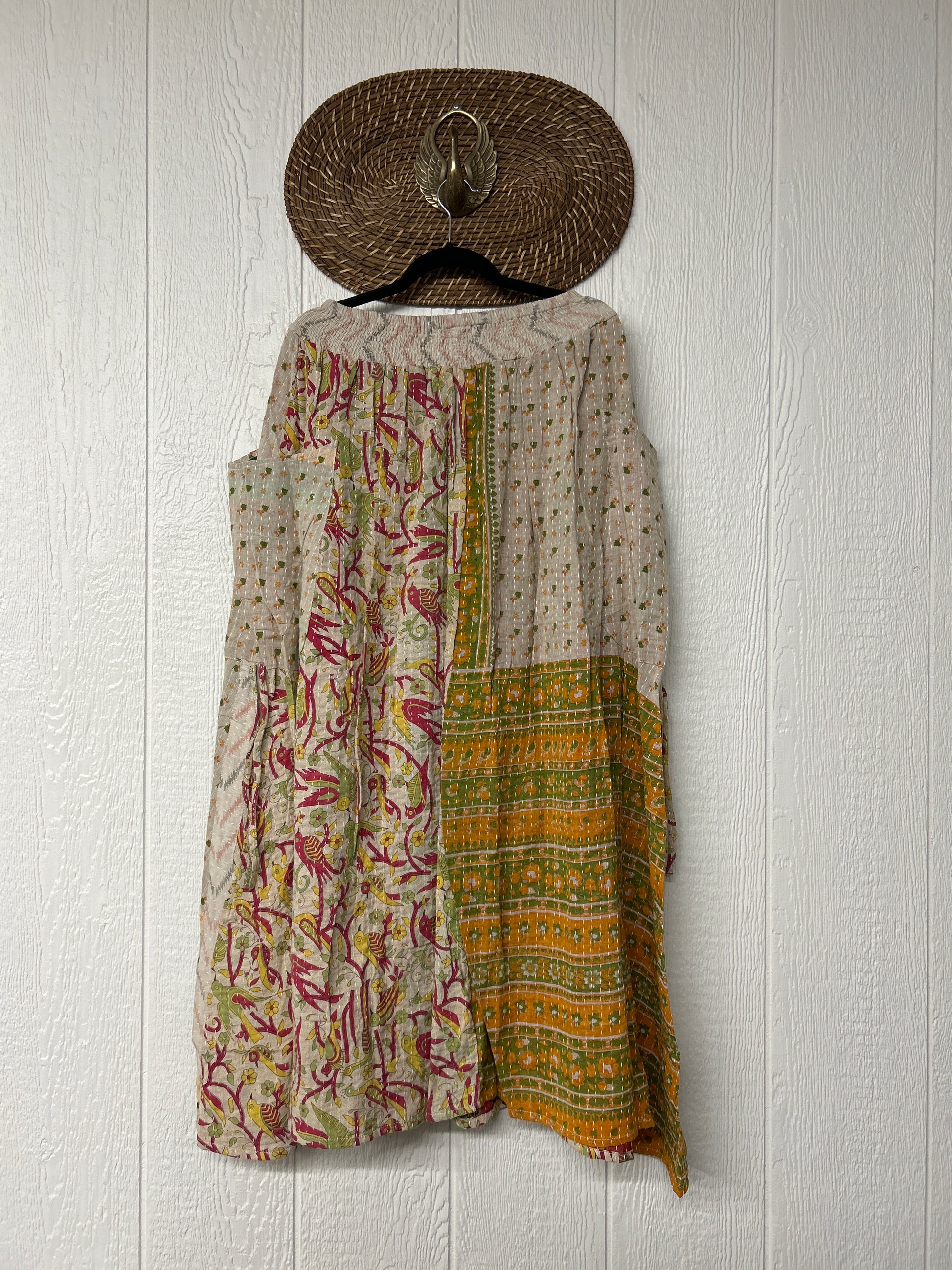 Crafted from kantha stitched vintage cotton sari this absolute dream features slouchy side pockets with a butterfly drawstring to cinch the sides, a button front skirt and a stretchy free size waist.