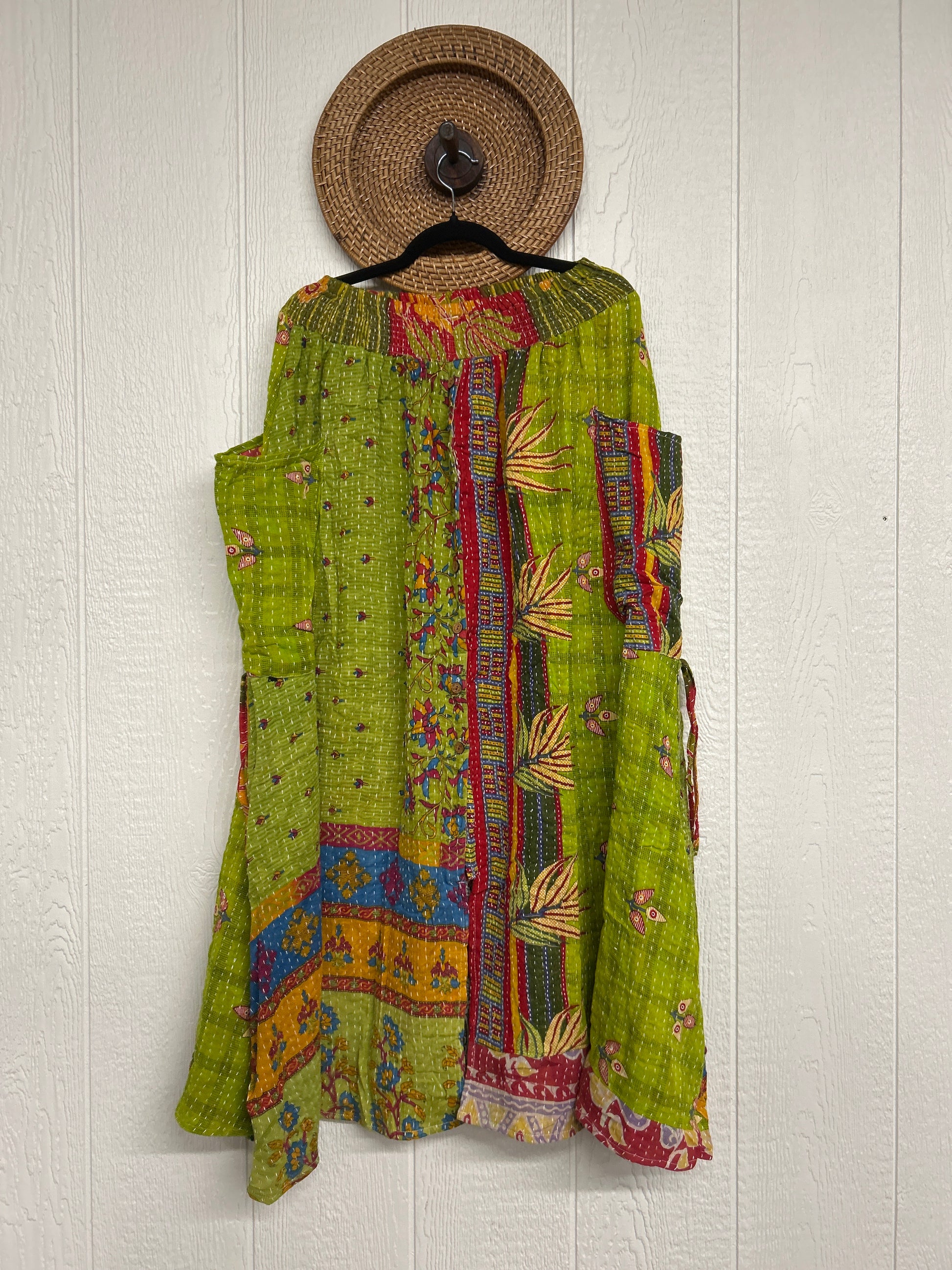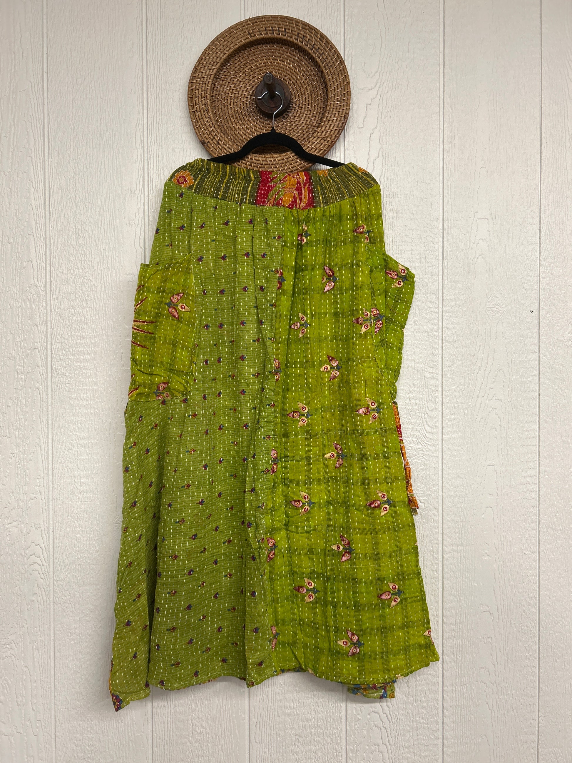 Crafted from kantha stitched vintage cotton sari this absolute dream features slouchy side pockets with a butterfly drawstring to cinch the sides, a button front skirt and a stretchy free size waist.