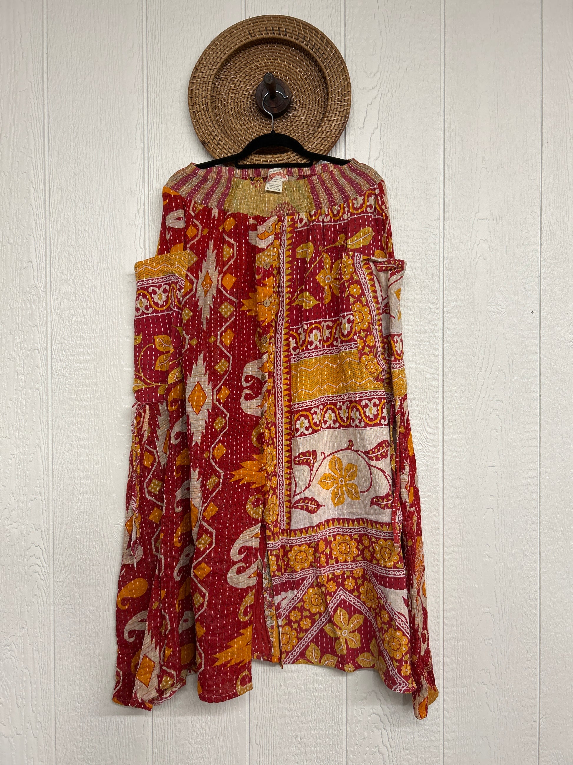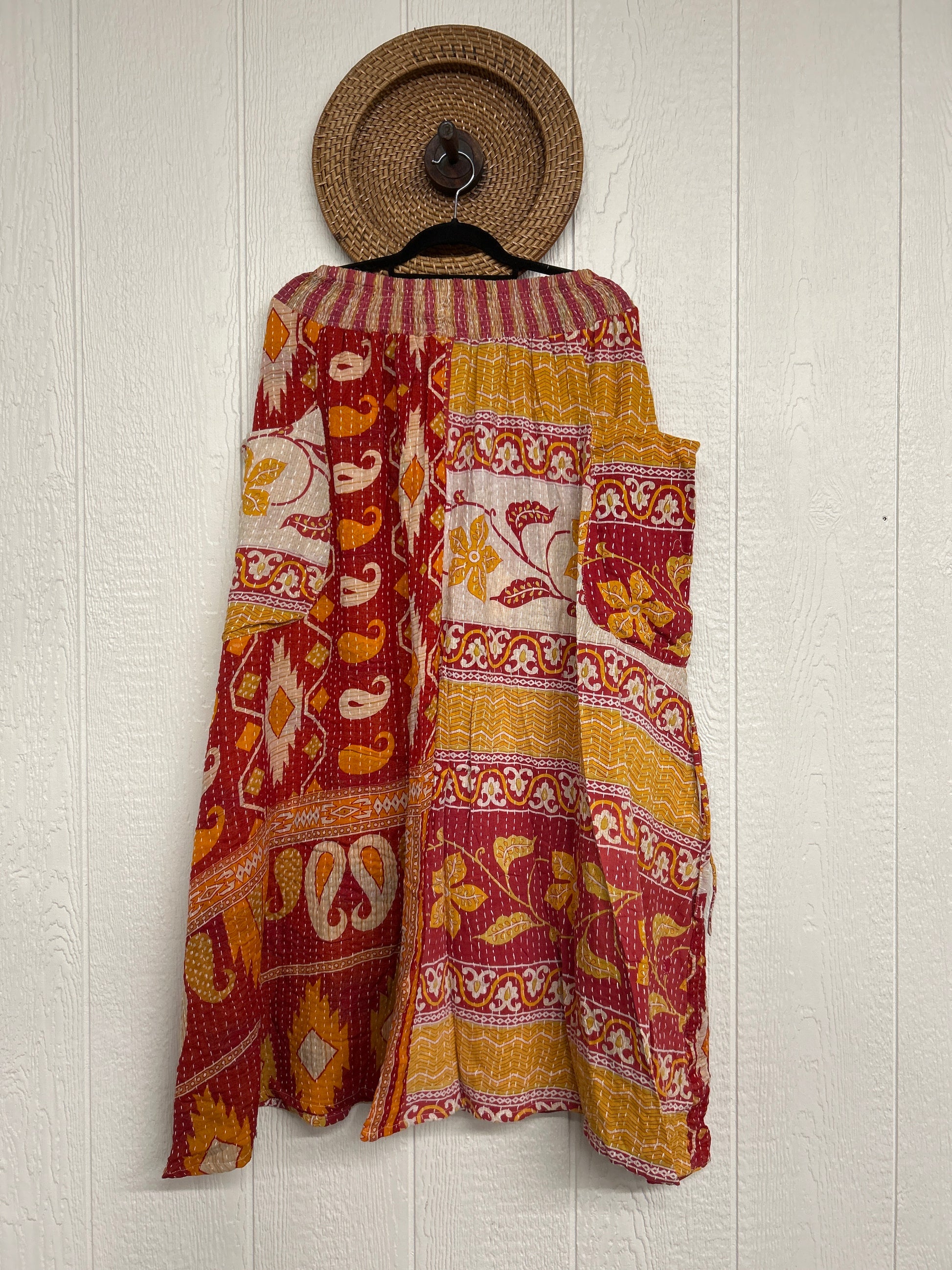 Crafted from kantha stitched vintage cotton sari this absolute dream features slouchy side pockets with a butterfly drawstring to cinch the sides, a button front skirt and a stretchy free size waist.