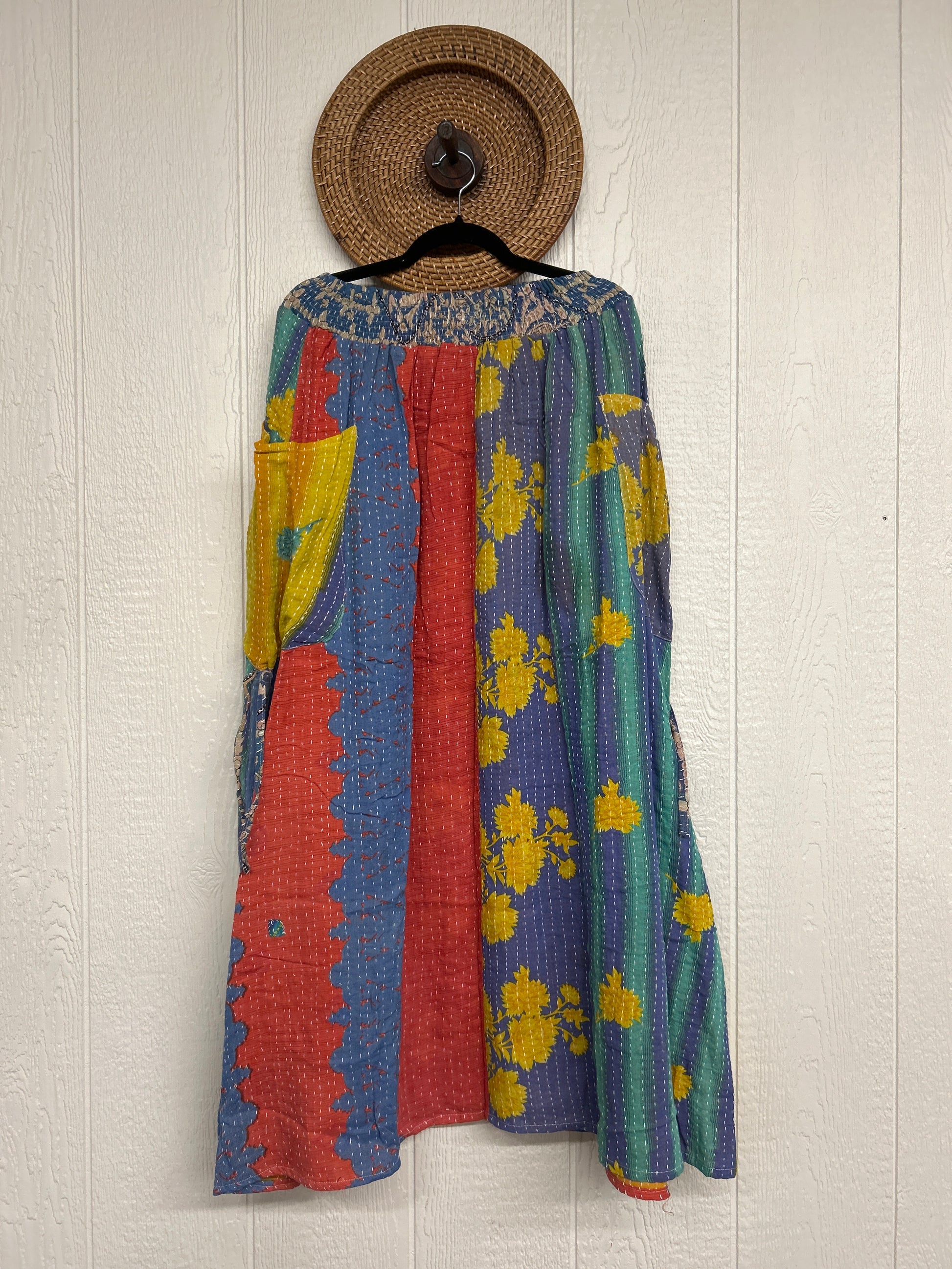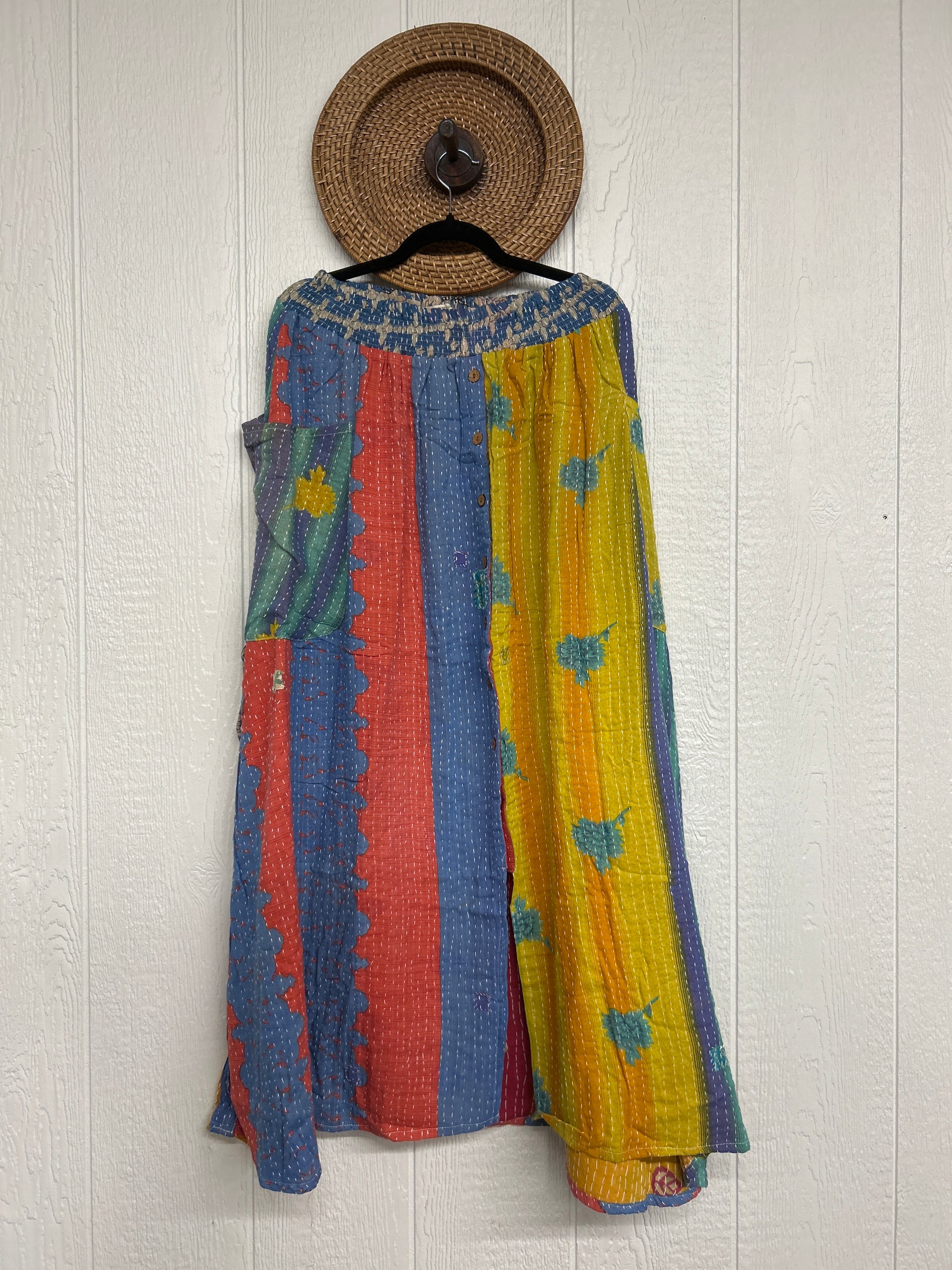 Crafted from kantha stitched vintage cotton sari this absolute dream features slouchy side pockets with a butterfly drawstring to cinch the sides, a button front skirt and a stretchy free size waist.
