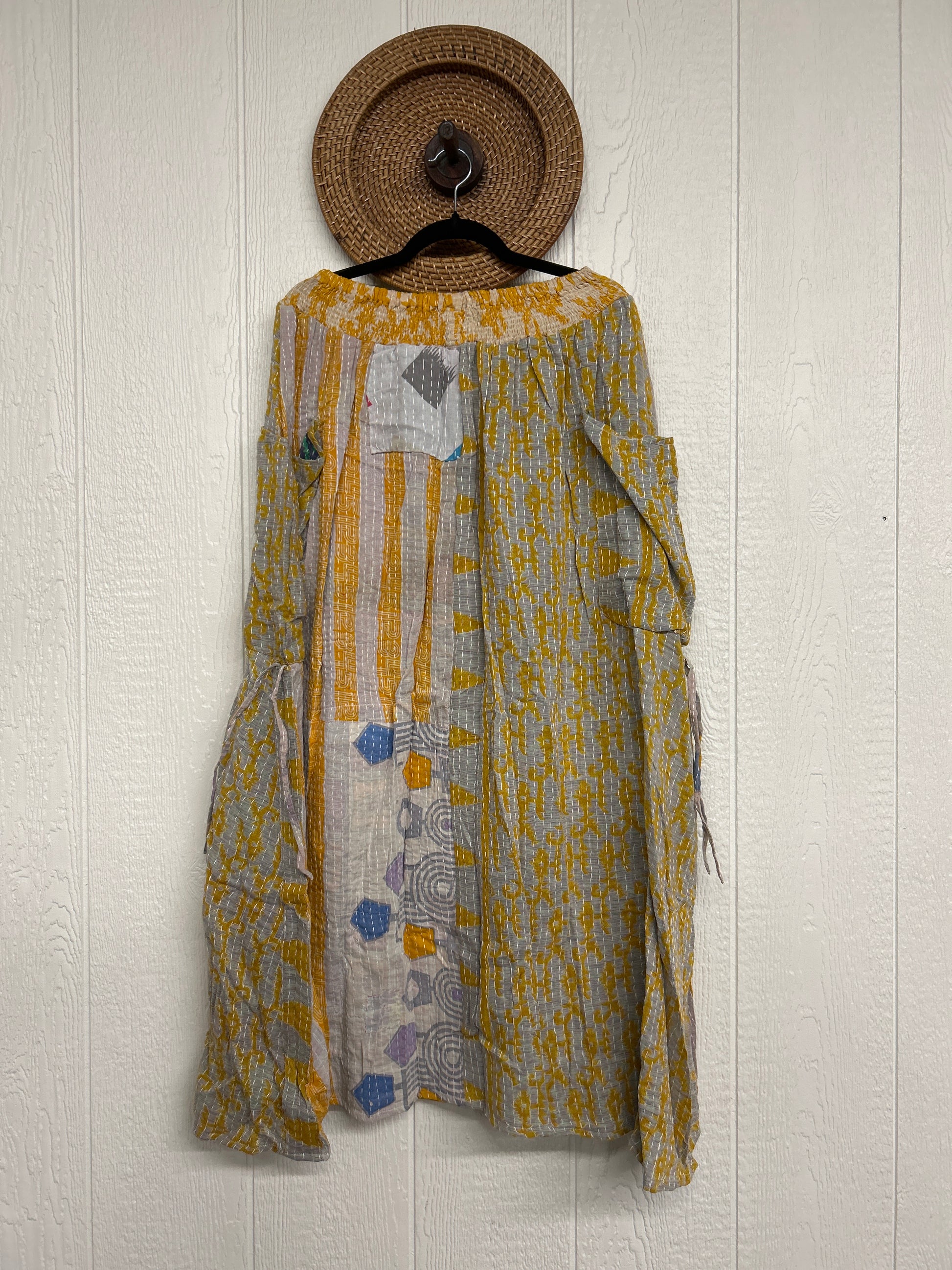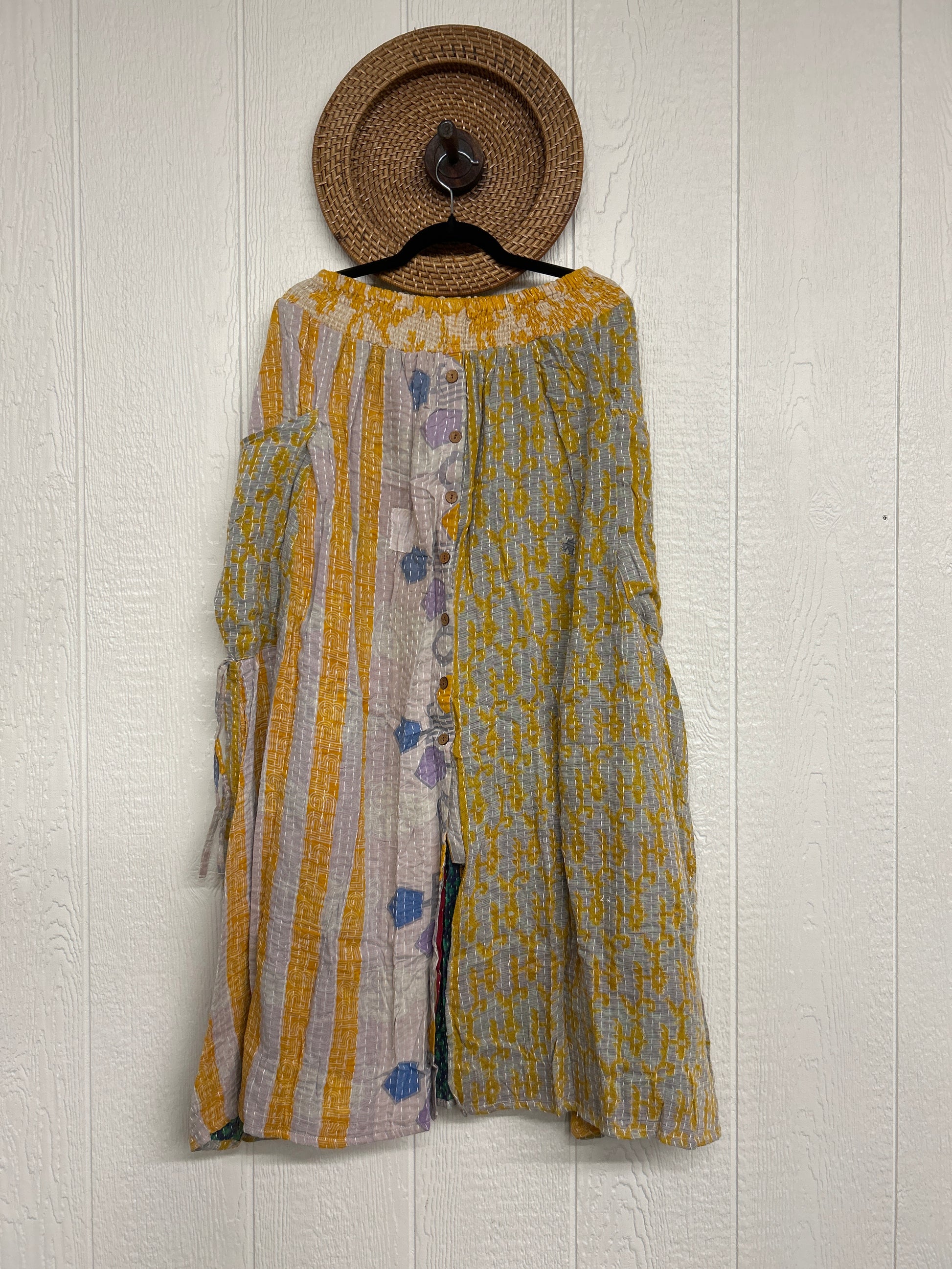 Crafted from kantha stitched vintage cotton sari this absolute dream features slouchy side pockets with a butterfly drawstring to cinch the sides, a button front skirt and a stretchy free size waist.