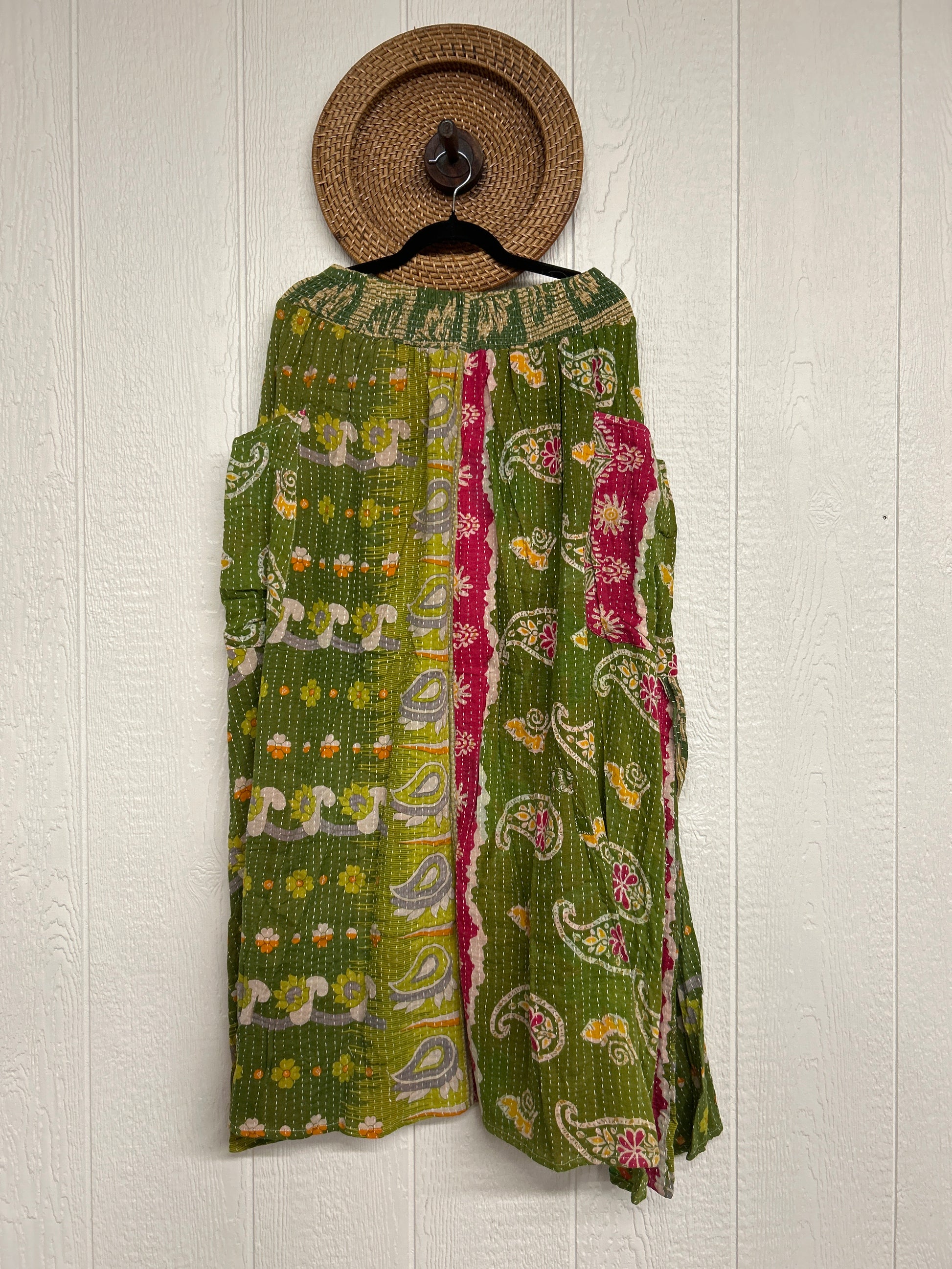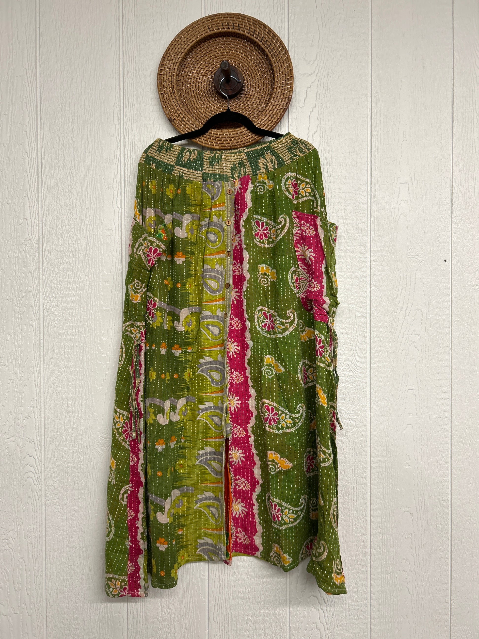 Crafted from kantha stitched vintage cotton sari this absolute dream features slouchy side pockets with a butterfly drawstring to cinch the sides, a button front skirt and a stretchy free size waist.