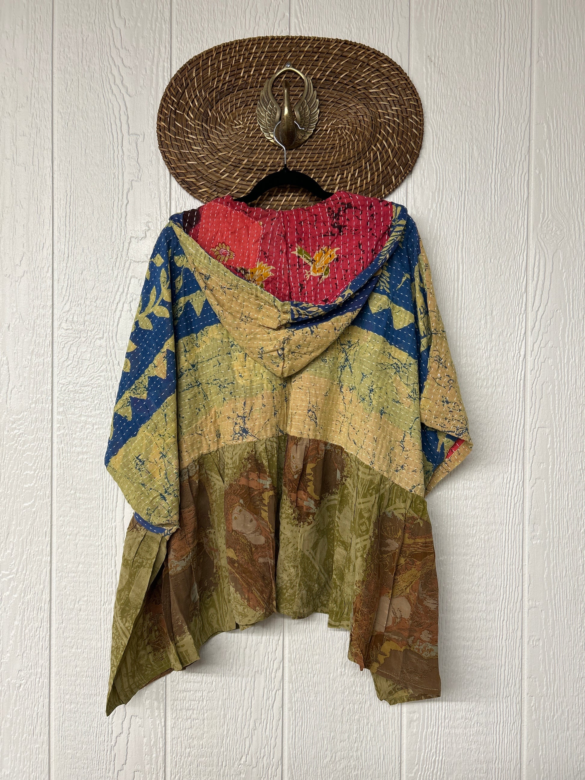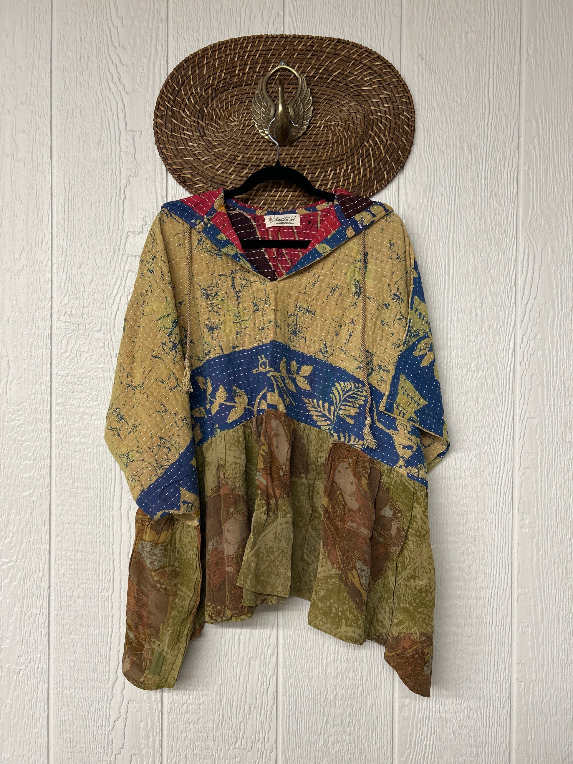 Your favorite throw on and go piece is made out of our vintage kantha embroidered sari with a crepe sari flounce. This poncho like silhouette is a flowy floaty dream.